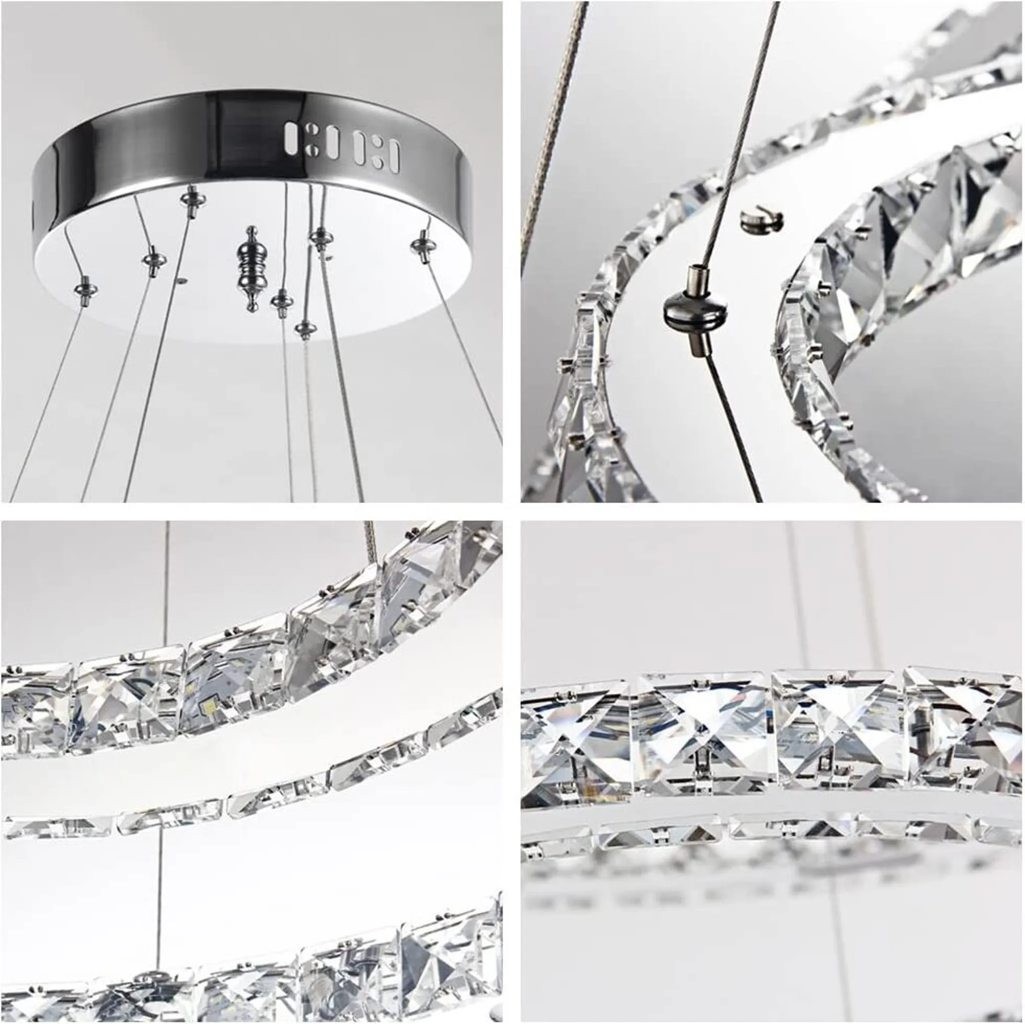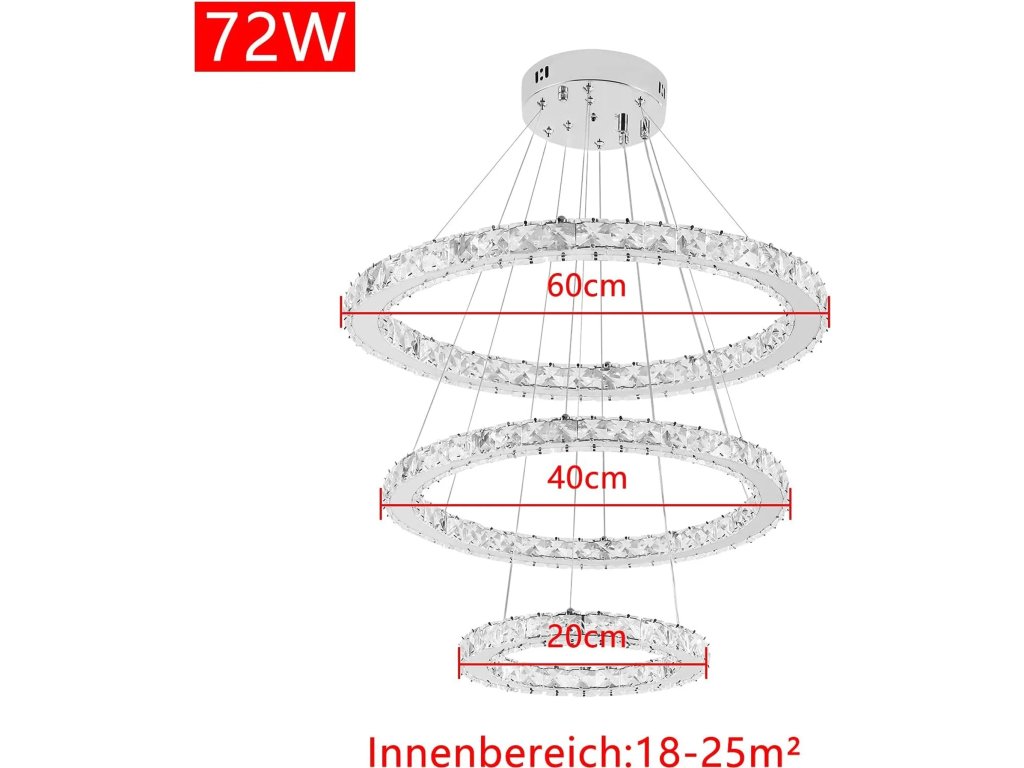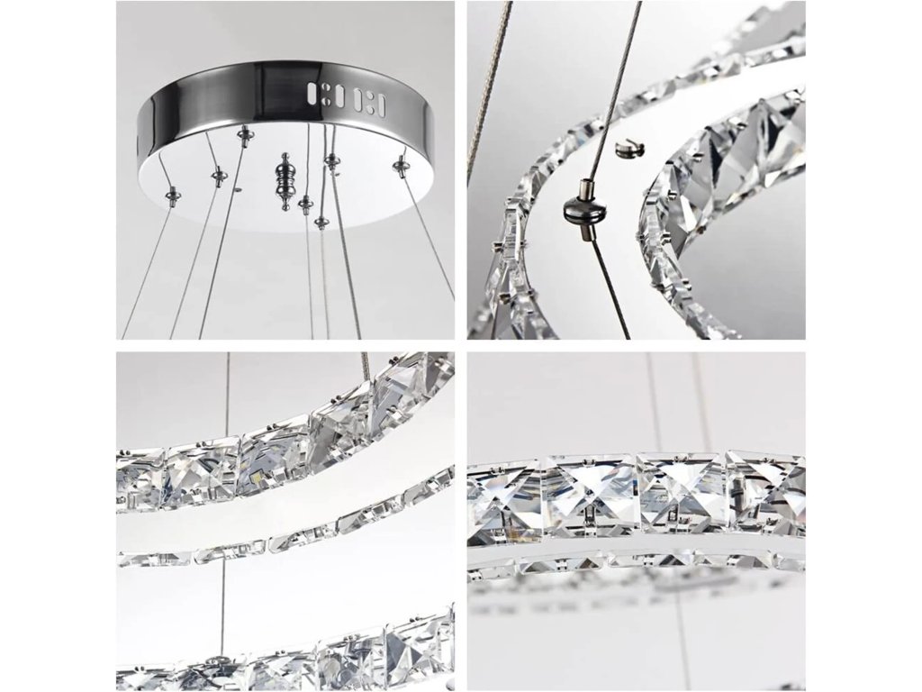 Svítidlo se skládá ze tří kroužků o průměrech 20 cm, 40 cm a 60 cm. Konstrukce z nerezové oceli ve spojení s krystaly vytváří luxusní dojem. Tento styl se výborně hodí do obývacího pokoje, ložnice i jídelny, kde vytvoří unikátní světelnou atmosféru.