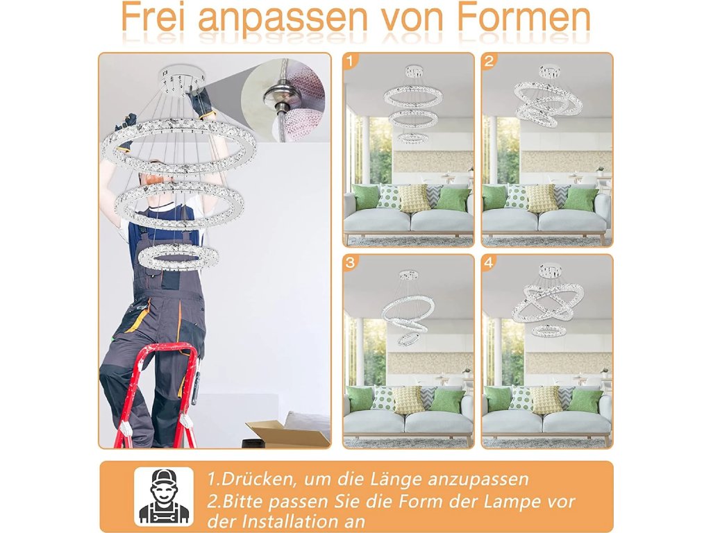 Každý z kroužků je upevněn na nerezových lankách s možností individuálního nastavení délky. Celkovou výšku závěsu lze měnit v rozmezí od 100 do 1500 mm. Uživatel si tak snadno upraví tvar a sklon lustru podle svých představ a výšky stropu v dané místnosti.