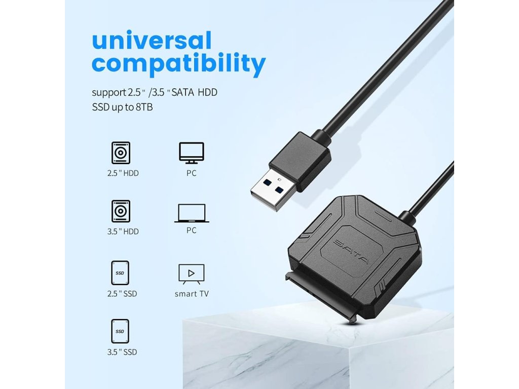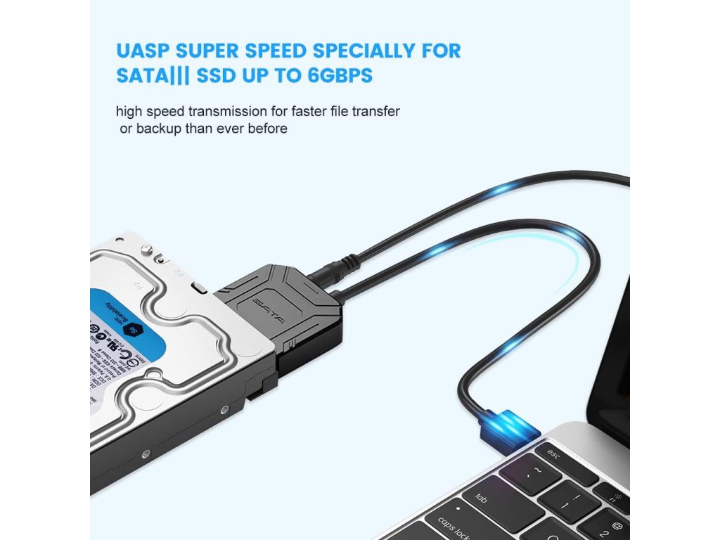 Adaptér podporuje rozhraní USB 3.0, které umožňuje vysokorychlostní přenos dat až do 6 Gb/s. Tento výkon je ideální pro přenos velkých souborů, což z něj činí efektivní nástroj pro uživatele, kteří potřebují rychle přenášet velké objemy dat. Podporuje disky s kapacitou až 10 TB, což vám poskytuje dostatek prostoru pro všechny vaše soubory, fotografie, videa a další důležitá data. Spolehlivost a rychlost tohoto adaptéru ocení jak domácí uživatelé, tak profesionálové.