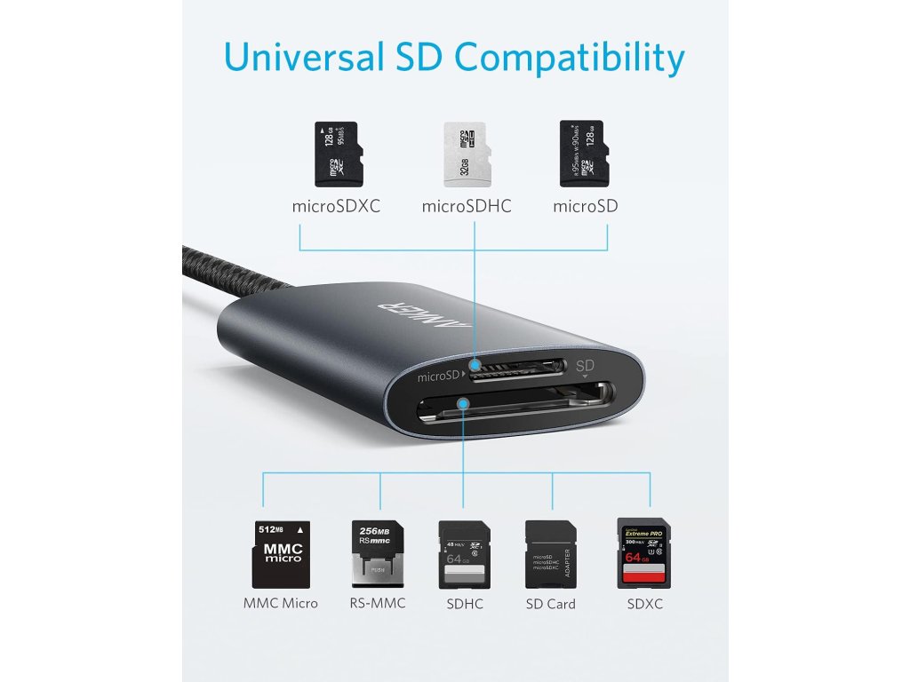 Čtečka je vybavena dvěma sloty: jedním pro SD kartu a druhým pro microSD kartu. Podporuje širokou škálu formátů paměťových karet, včetně SDXC, SDHC, MicroSD, MMC, RS-MMC, Micro SDXC a Micro SDHC. Je plně zpětně kompatibilní s kartami standardů UHS-I i UHS-II.