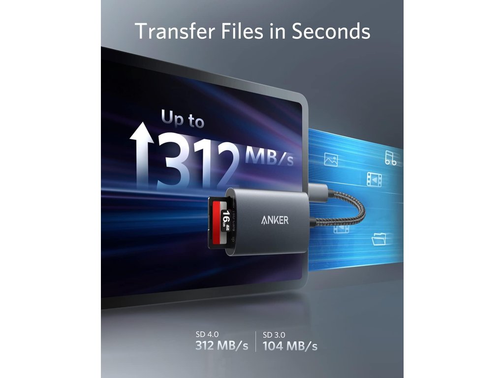 Díky podpoře nejnovějšího standardu UHS-II (SD 4.0) pro SD karty dosahuje čtečka Anker PowerExpand+ bleskových přenosových rychlostí až 312 MB/s. To zásadně zrychluje práci s velkými soubory, jako jsou videa ve vysokém rozlišení nebo rozsáhlé fotografické knihovny, a minimalizuje čekací doby.