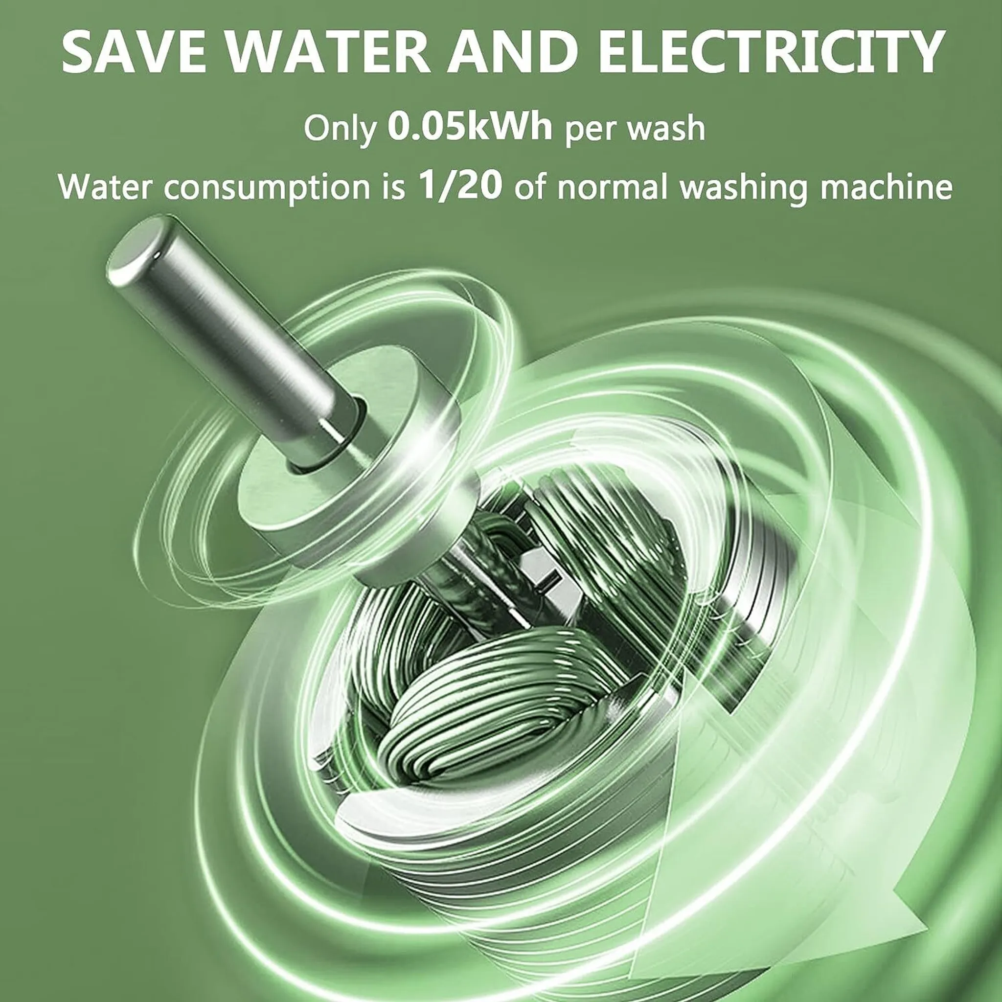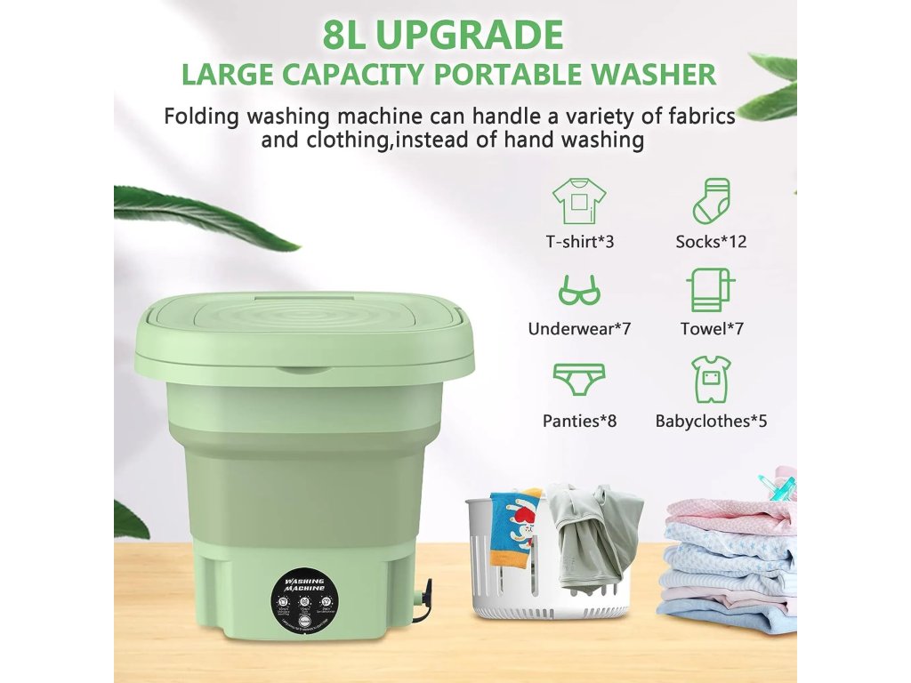 Skládací konstrukce nezabírá téměř žádné místo a usnadňuje skladování. Zařízení je perfektní pro cestování, pobyt v karavanu nebo ubytování pro studenty. Pračka s objemem 8 litrů je ideální pro péči o drobné textilie, jako jsou dětské oblečení, spodní prádlo, ponožky, plyšové hračky nebo utěrky. Při praní většího množství nebo silnějších oděvů je doporučeno prádlo vyždímat ručně