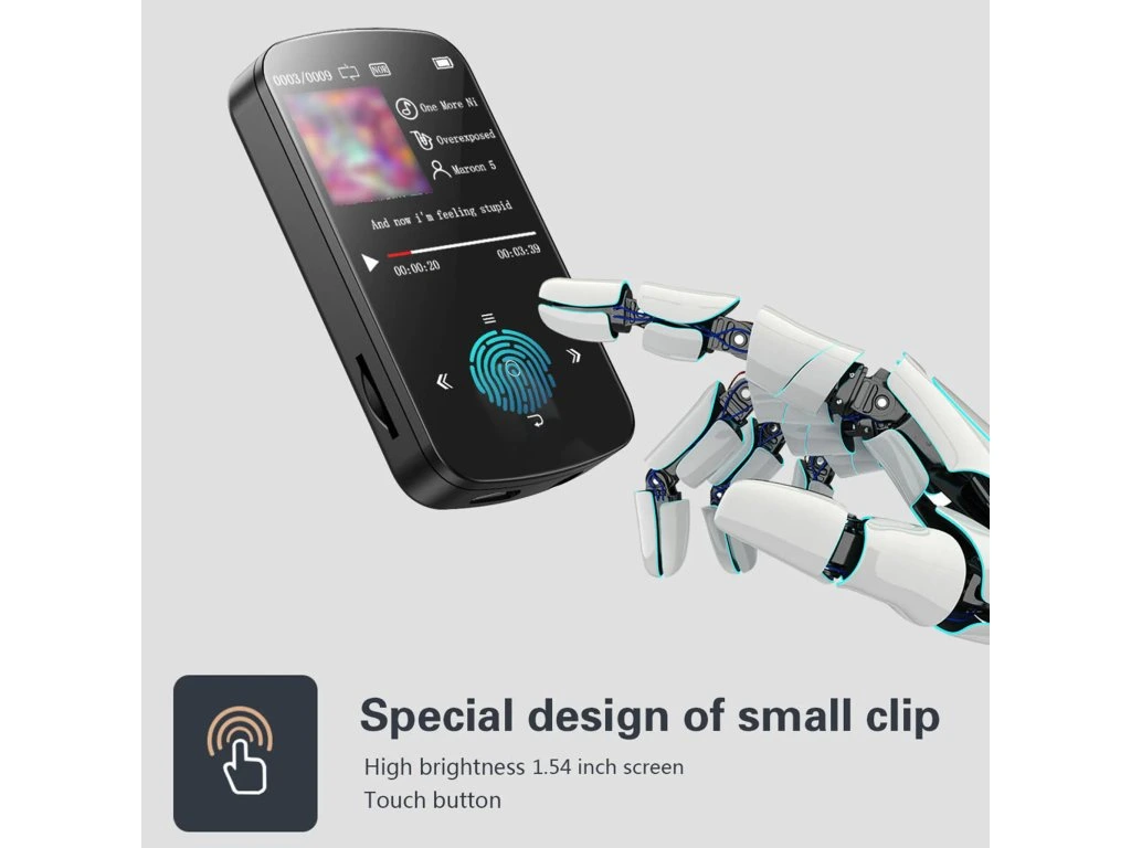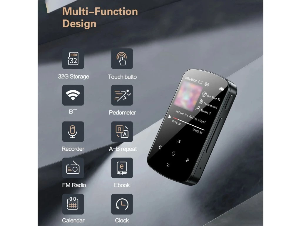 Přehrávač vyniká svou ultratenkou konstrukcí a hmotností pouhých 23 gramů. Integrovaný klip umožňuje pevné uchycení na tričko nebo kalhoty, díky tomu vás zařízení nijak neomezuje při běhu či jiném cvičení. Součástí výbavy je také fitness tracker, ten zaznamenává počet ušlých kroků, překonanou vzdálenost i spálené kalorie.