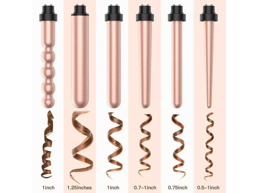 Sada obsahuje šest různých nástavců z turmalínové keramiky, které umožňují styling vlasů přesně podle vašich představ. K dispozici je hlavice o průměru 32 mm pro volné vlny, 25 mm pro přirozené kadeře a 19 mm pro menší vlny. Specifické tvary jako kónický nástavec 18–25 mm nebo korálkový nástavec o velikosti 25 mm zajistí moderní i retro vzhled.