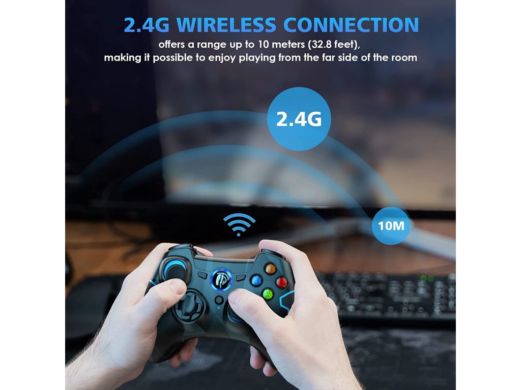 Technologie bezdrátového přenosu 2,4G zajišťuje stabilní připojení bez jakékoli prodlevy a nabízí dosah až 10 metrů (32,8 stop), takže si můžete užívat hraní ze vzdálené strany místnosti