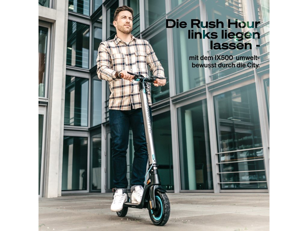 Model IX500 se může pochlubit moderním designem s rukojeťmi z PU kůže a integrovaným LCD displejem, který v reálném čase zobrazuje aktuální rychlost a stav baterie. Pro snadnou přepravu a skladování je koloběžka vybavena chytrým skládacím mechanismem Easy Folding, díky kterému ji lze rychle složit do kompaktní velikosti. Díky těmto vlastnostem je ideálním společníkem na každodenní dojíždění i na volnočasové výlety
