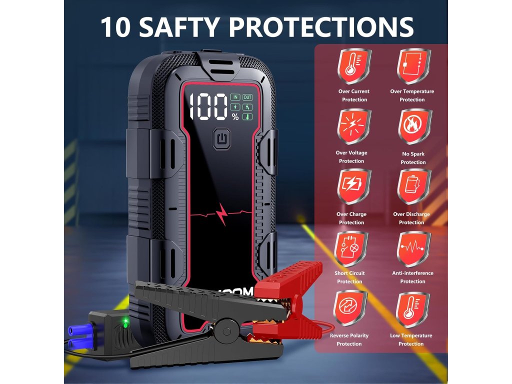 Prodlužené robustní startovací kabely jsou vybaveny inteligentními svorkami s 10 ochrannými funkcemi. Integrované bezpečnostní prvky zahrnují ochranu proti přepólování, zkratu a automatickou detekci chyb, zajišťujíce tak maximální bezpečnost při každém použití. Širší rozevření svorek a jejich lepší vodivost usnadňují připojení k baterii.