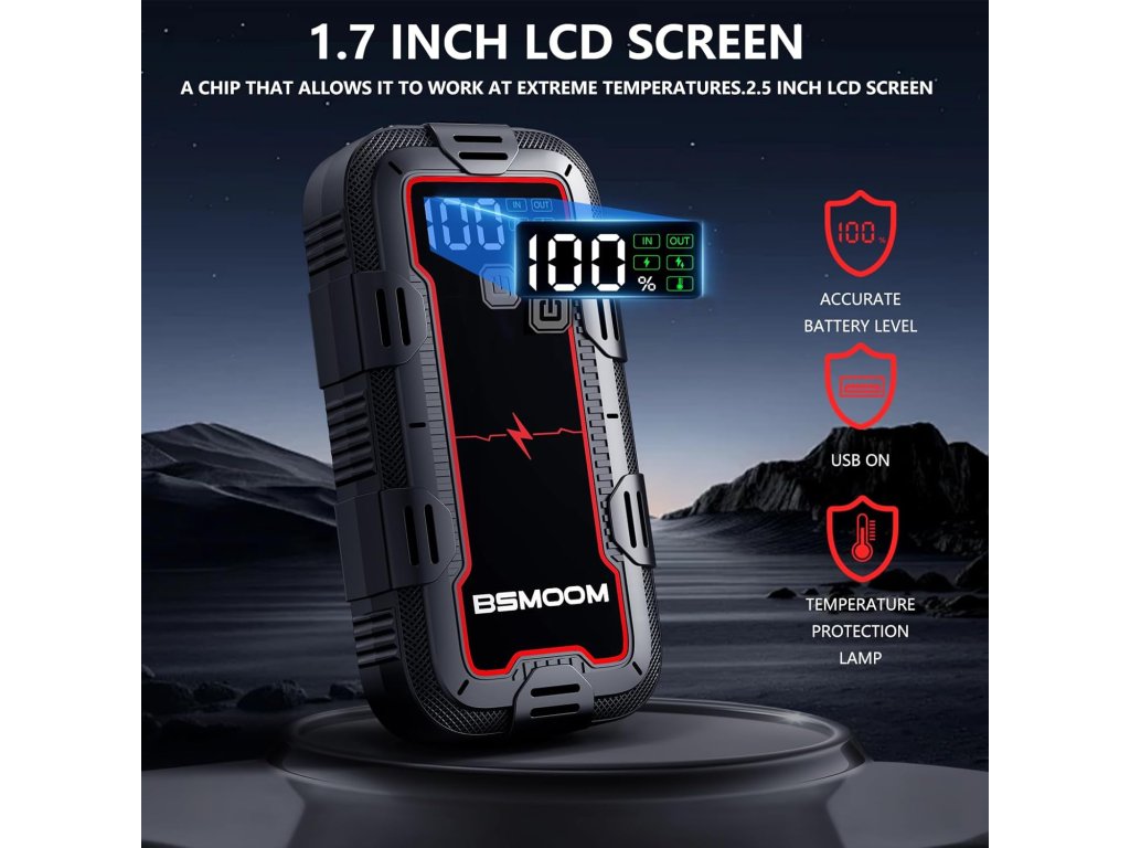 Startér má vestavěný 1,7palcový (4,32 cm) LCD displej, který přehledně zobrazuje provozní stav a úroveň nabití baterie. Kompaktní a stylový design s kovovými hranami zvyšuje odolnost proti nárazům. Pevné pouzdro chrání stanici před deštěm, prachem a pády, doplňuje to i jasné LED svítilna se čtyřmi režimy (svícení, blikání, SOS a varování) pro nouzové situace