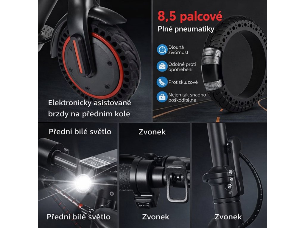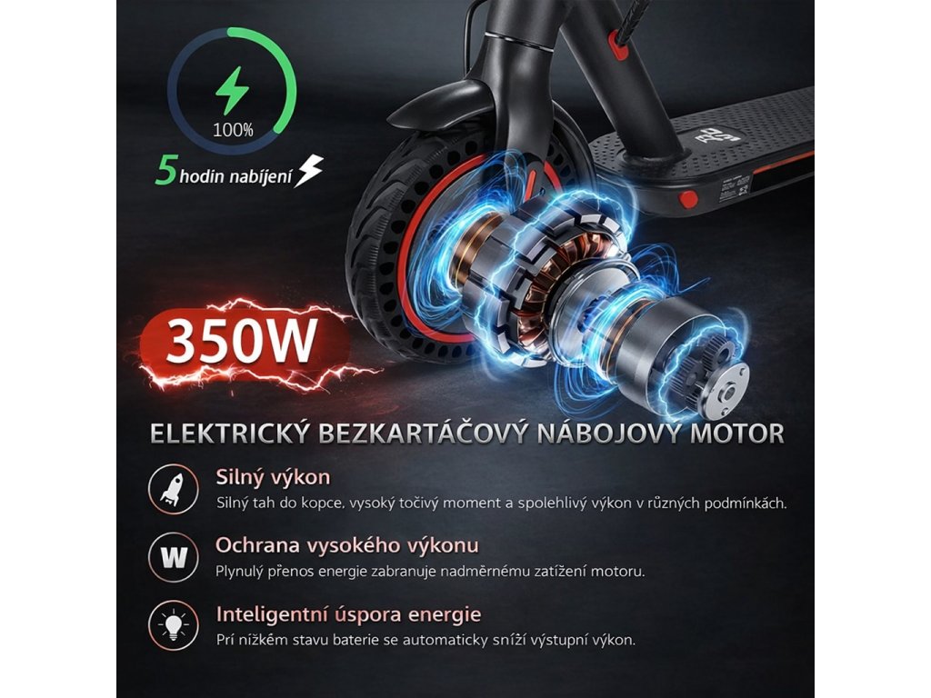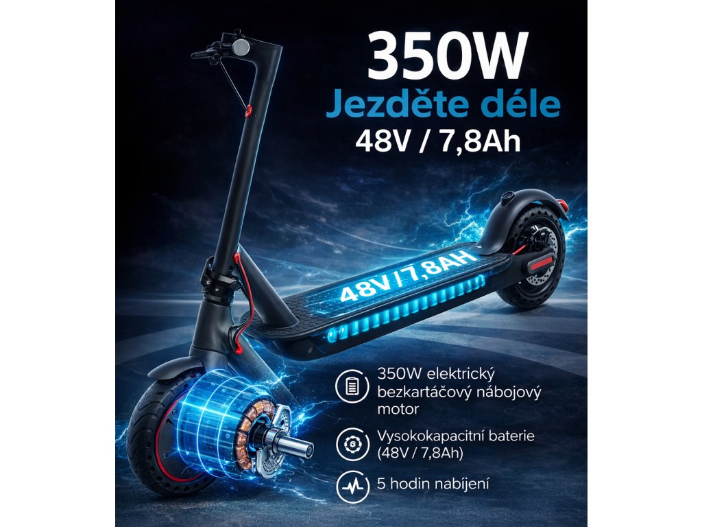 Koloběžka je osazena 350W bezkartáčovým motorem (48V) a 8,5" plnými protiskluzovými pneumatikami, díky nimž dosahuje rychlosti až 20 km/h.