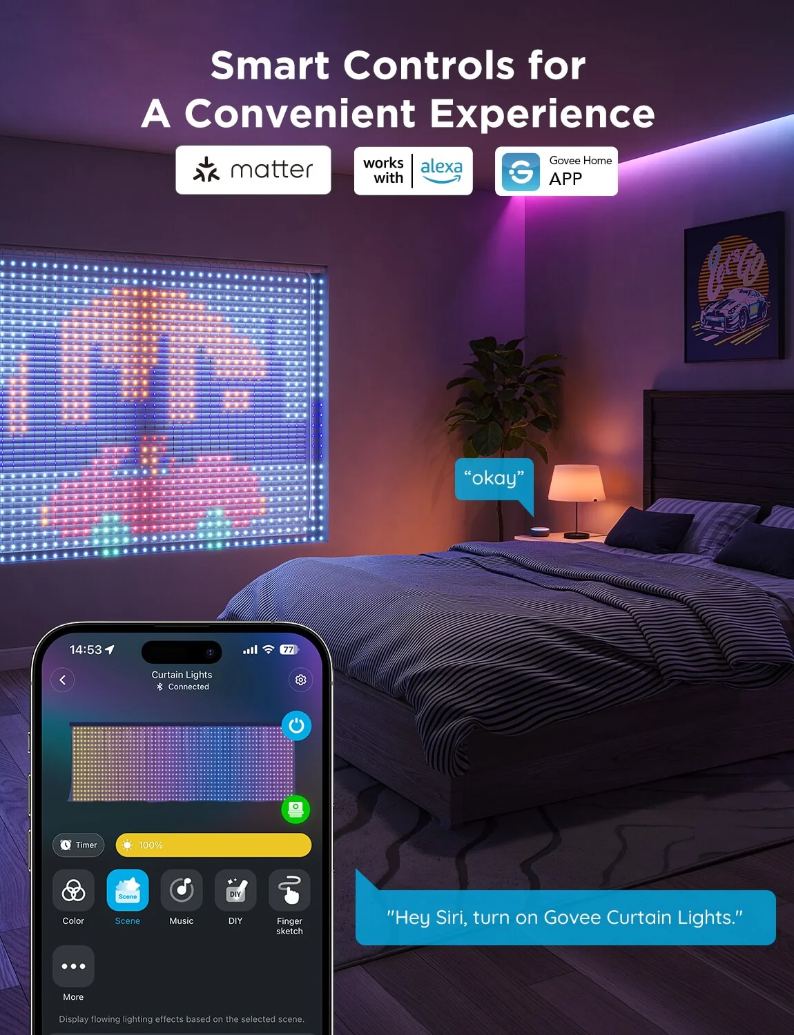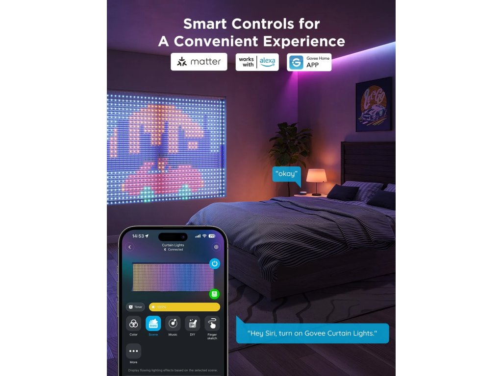 Ovládejte světla pohodlně pomocí aplikace Govee Home, hlasových asistentů Alexa a Google Assistant nebo je integrujte do své chytré domácnosti díky podpoře Matter. Technologie SceneStage posouvá synchronizaci na novou úroveň, koordinuje více zařízení Govee a vytváří jednotný, pohlcující světelný displej reagující na své okolí