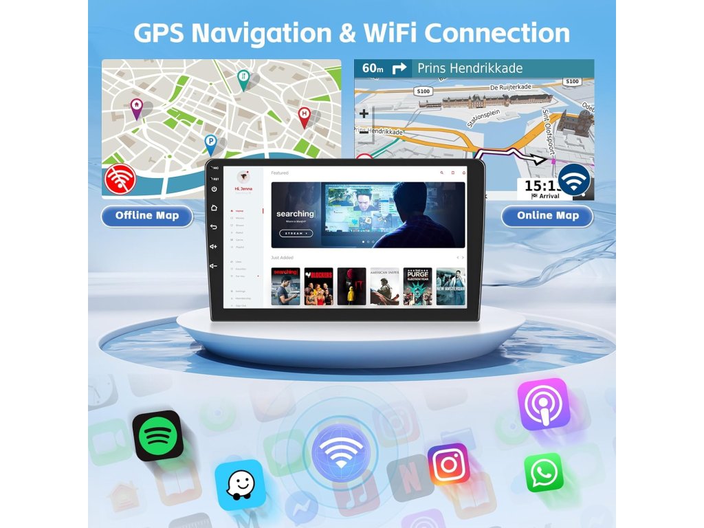 Autorádio disponuje vestavěným GPS modulem s předinstalovanými offline mapami v aplikaci "HereWeGo". Po připojení k 5G WiFi síti se otevírá přístup k online mapám a možnost stahovat oblíbené aplikace, jako jsou YouTube, Spotify nebo TikTok, přímo z Obchodu Play. Funkce Mirror Link umožňuje synchronizaci obrazovky Android nebo iOS telefonu pro zobrazení obsahu na velkém 10,1palcovém displeji.