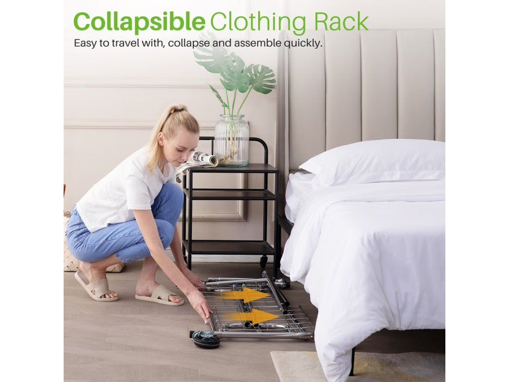 Horní závěsná tyč disponuje teleskopickým mechanismem umožňujícím prodloužení v rozmezí přibližně 116 až 180 cm. Výšku celého stojanu lze nastavit do dvou úrovní, konkrétně 163 cm nebo 173 cm. Tato variabilita usnadňuje ukládání krátkých triček i velmi dlouhých šatů. Spodní drátěná police pak poskytuje dodatečný prostor pro boty, boxy nebo další doplňky.