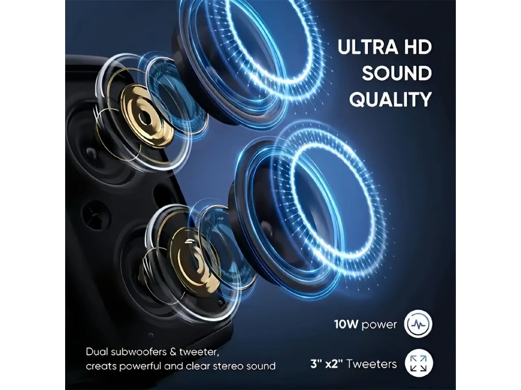 Reproduktor HY-3317 disponuje dvojicí 3" měničů a výkonem 10 W. Integrovaný subwoofer zajišťuje bohaté basy a čistý stereofonní zvuk vhodný pro hudbu, filmy i karaoke.