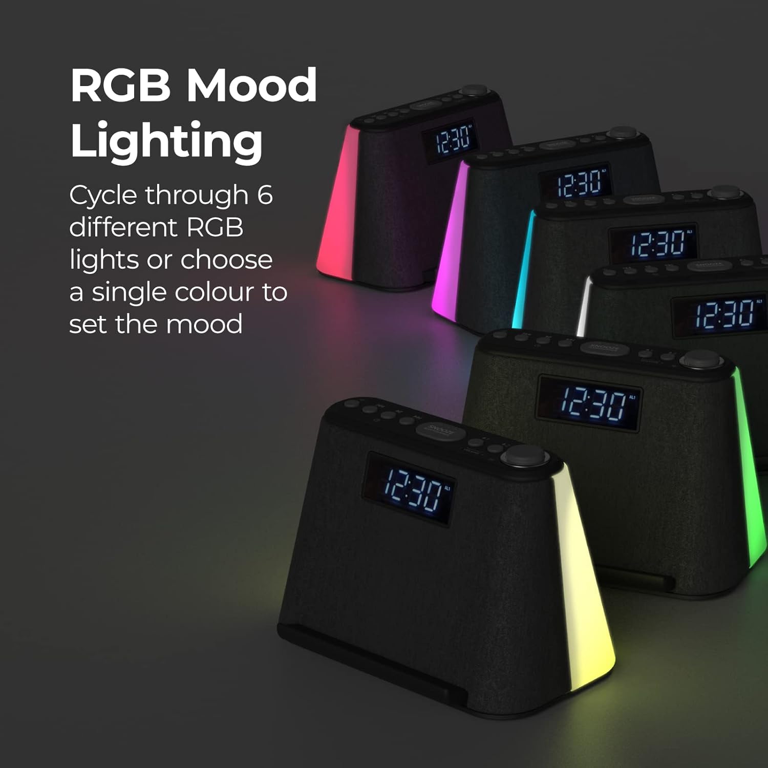 Atmosférické osvětlení nabízí 6 režimů RGB, které mohou cyklovat nebo svítit jednou barvou podle vašeho výběru. Můžete si vytvořit vlastní náladové světlo, osvětlení pro čtení nebo jemné pozadí s nastavitelnou intenzitou jasu. Moderní design doplňuje praktická funkce záložní baterie (2x AA, nejsou součástí balení), která zajistí spolehlivé buzení i v případě výpadku proudu během noci