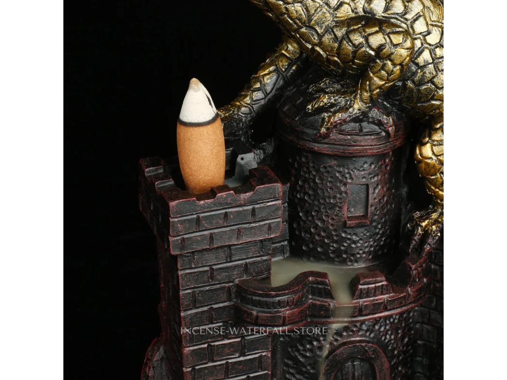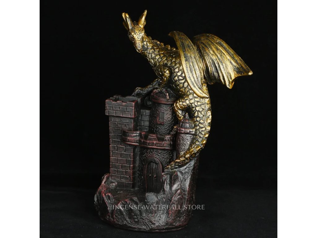 Tato kaskádová lampa je vyrobena z kvalitní keramiky a představuje ručně zpracované umělecké dílo. Detailní ztvárnění zlatého draka sedícího na hradě dodává produktu unikátní fantasy vzhled, který se stane výrazným prvkem každého interiéru. Její rozměry 16 x 10 x 21 cm umožňují snadné umístění na různé povrchy.