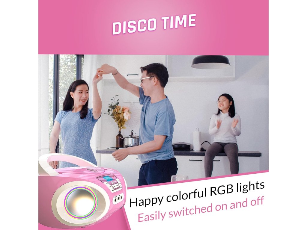 Zařízení je k dispozici v roztomilé růžové barvě, která je pro děti velmi atraktivní. Je navrženo jako malý a lehký boombox s rukojetí, usnadňuje to přenášení po domě nebo na cesty. Je ideální pro batolata a menší děti jako jejich první stereo systém pro poslech hudby a příběhů.