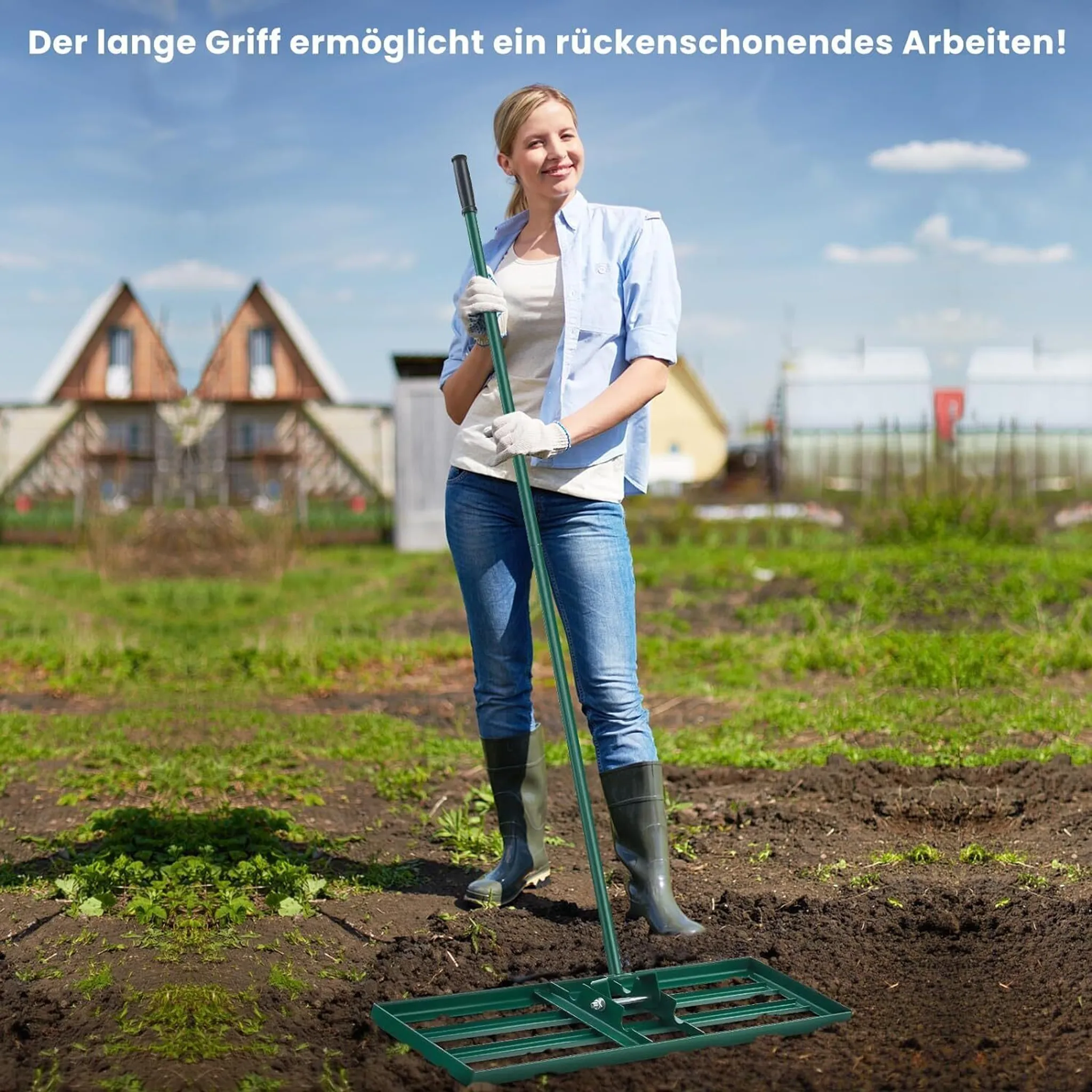 Násada o délce 170 cm je navržena tak, aby uživateli zajistila vzpřímený postoj během práce. Horní část rukojeti je opatřena protiskluzovým PVC materiálem, který nabízí bezpečný a stabilní úchop i v rukavicích. Celková čistá hmotnost 5,3 kg zajišťuje dostatečný přítlak pro efektivní nivelaci, aniž by nástroj byl příliš těžký pro běžnou zahradní údržbu.