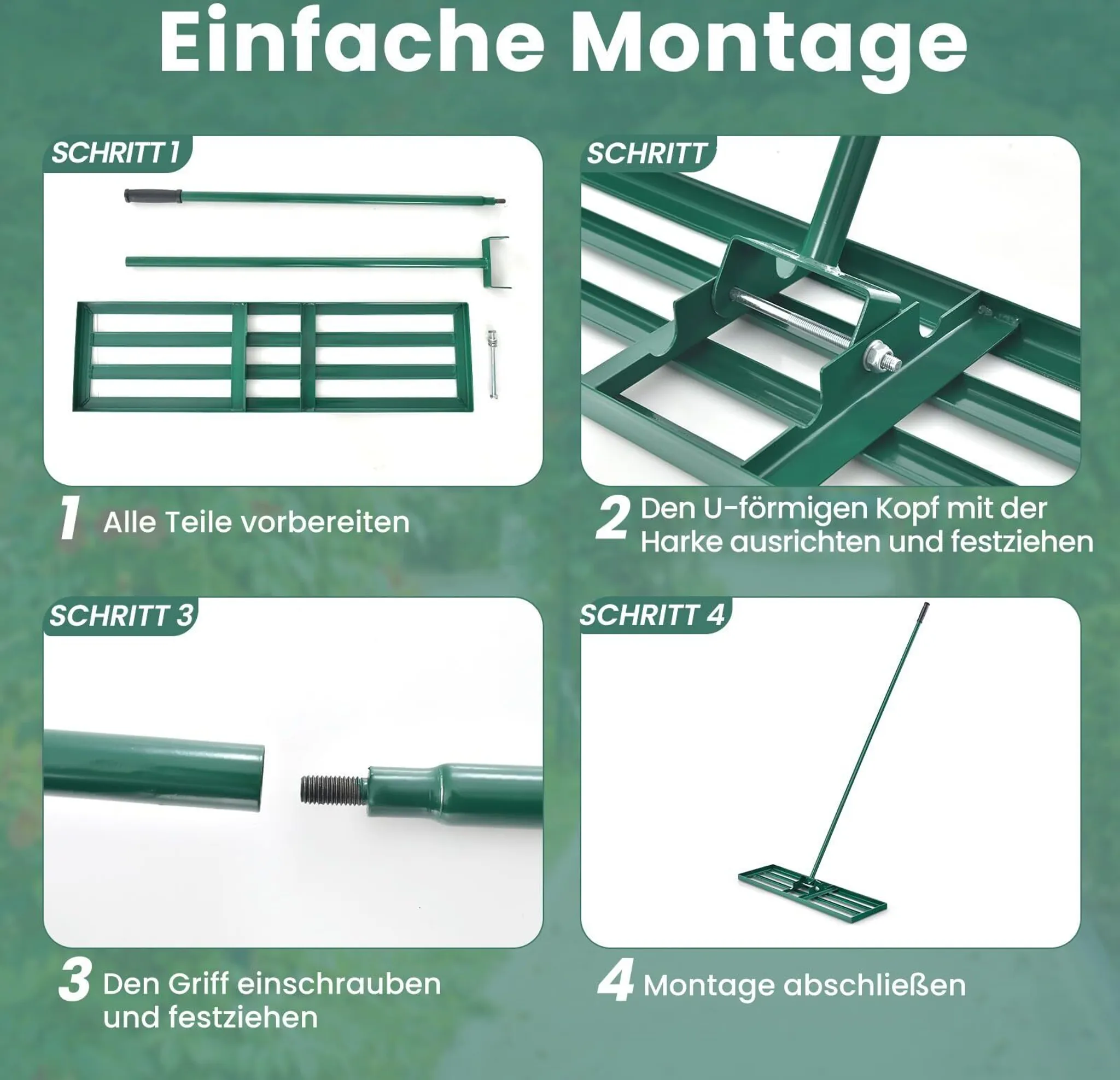 Hrábě využívají praktickou šroubovací konstrukci, díky které je lze rychle sestavit bez nutnosti použití speciálního nářadí. Tento systém je výhodný také pro uskladnění mimo sezónu, protože násadu lze snadno rozložit na menší díly. Nářadí je okamžitě připraveno k použití na zahradách, terasách nebo i na profesionálních golfových hřištích