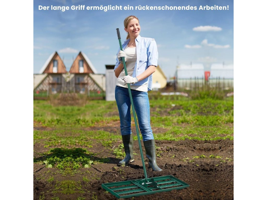 Násada o délce 170 cm je navržena tak, aby uživateli zajistila vzpřímený postoj během práce. Horní část rukojeti je opatřena protiskluzovým PVC materiálem, který nabízí bezpečný a stabilní úchop i v rukavicích. Celková čistá hmotnost 5,3 kg zajišťuje dostatečný přítlak pro efektivní nivelaci, aniž by nástroj byl příliš těžký pro běžnou zahradní údržbu.