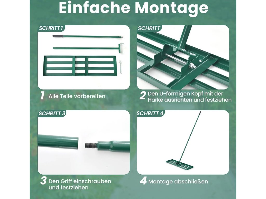 Hrábě využívají praktickou šroubovací konstrukci, díky které je lze rychle sestavit bez nutnosti použití speciálního nářadí. Tento systém je výhodný také pro uskladnění mimo sezónu, protože násadu lze snadno rozložit na menší díly. Nářadí je okamžitě připraveno k použití na zahradách, terasách nebo i na profesionálních golfových hřištích