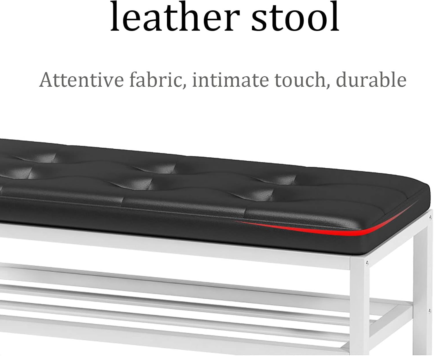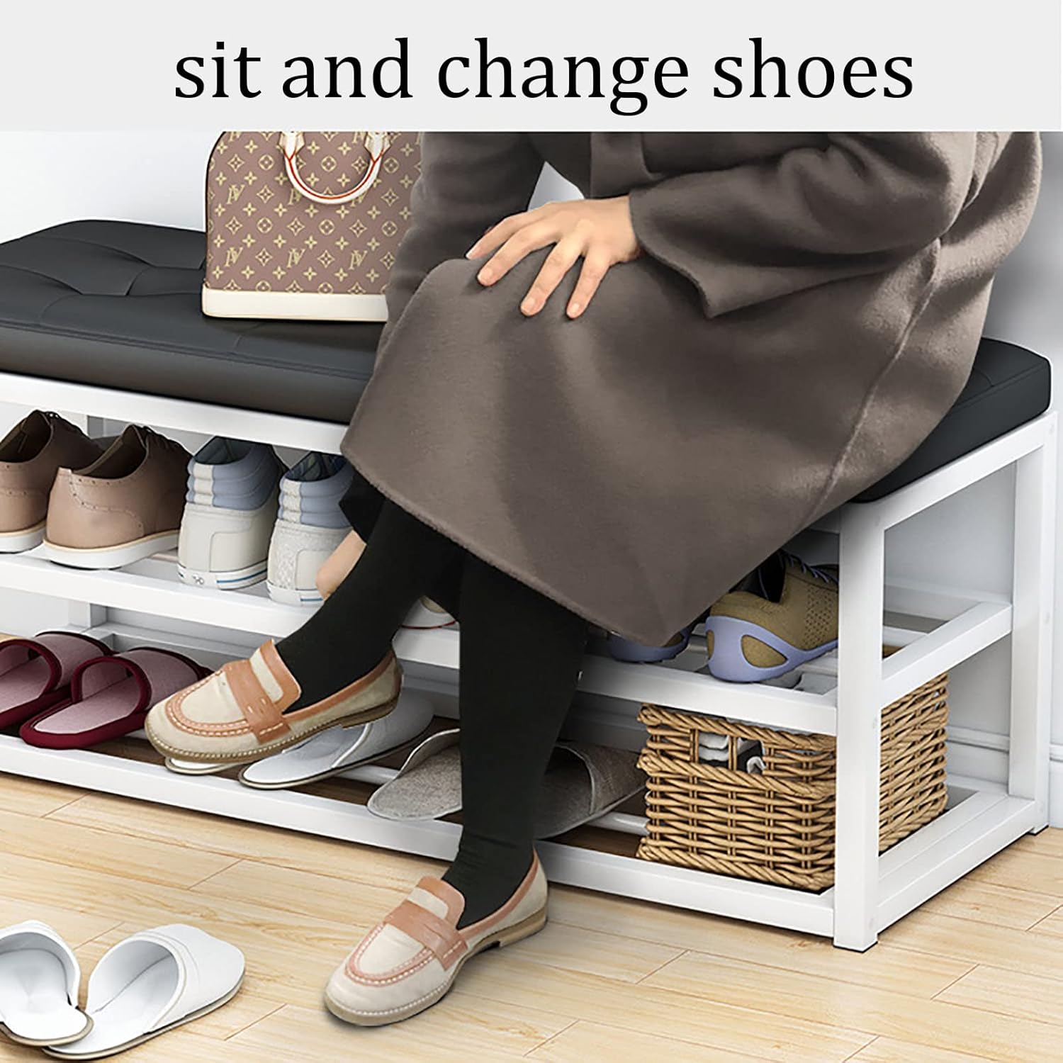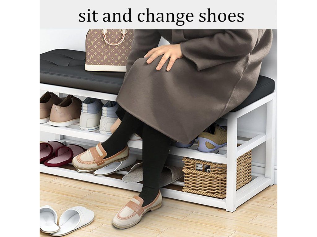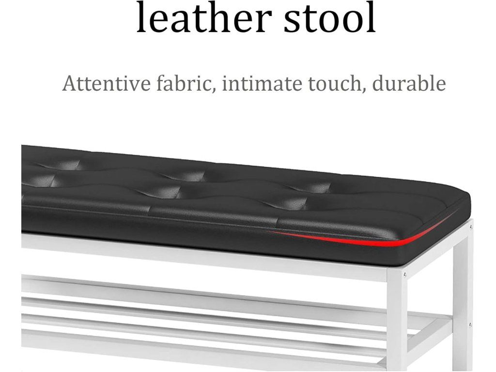 Horní část tvoří měkký polštář z PU syntetické kůže, který poskytuje vysoký komfort při sezení nebo odkládání osobních věcí. Pod sedákem se nacházejí dvě další úrovně drátěných polic, přičemž každá vrstva pojme až 4 páry bot. Rozestup mezi jednotlivými policemi je 16 cm, což poskytuje dostatečný prostor pro běžnou obuv i nízké kozačky.