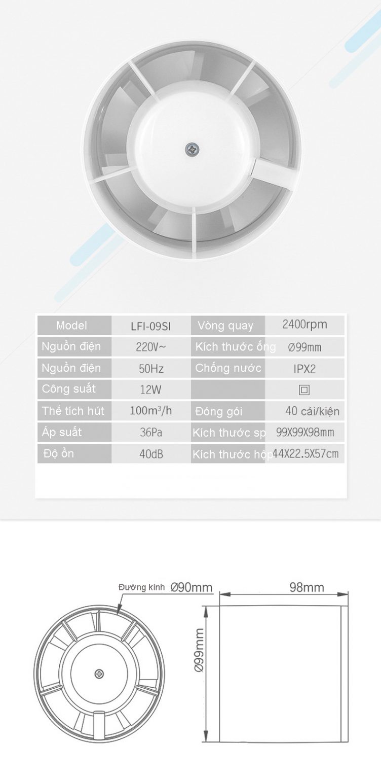 Model LFI-09SI nabízí maximální průtok vzduchu 100 metrů krychlových za hodinu při velmi nízké spotřebě elektrické energie 12 W. Samotný motor dosahuje rychlosti 2400 otáček za minutu a vytváří provozní tlak 36 Pa. Hlučnost zařízení se drží na přijatelné úrovni 40 dB, takže nebude rušit vaše každodenní aktivity.