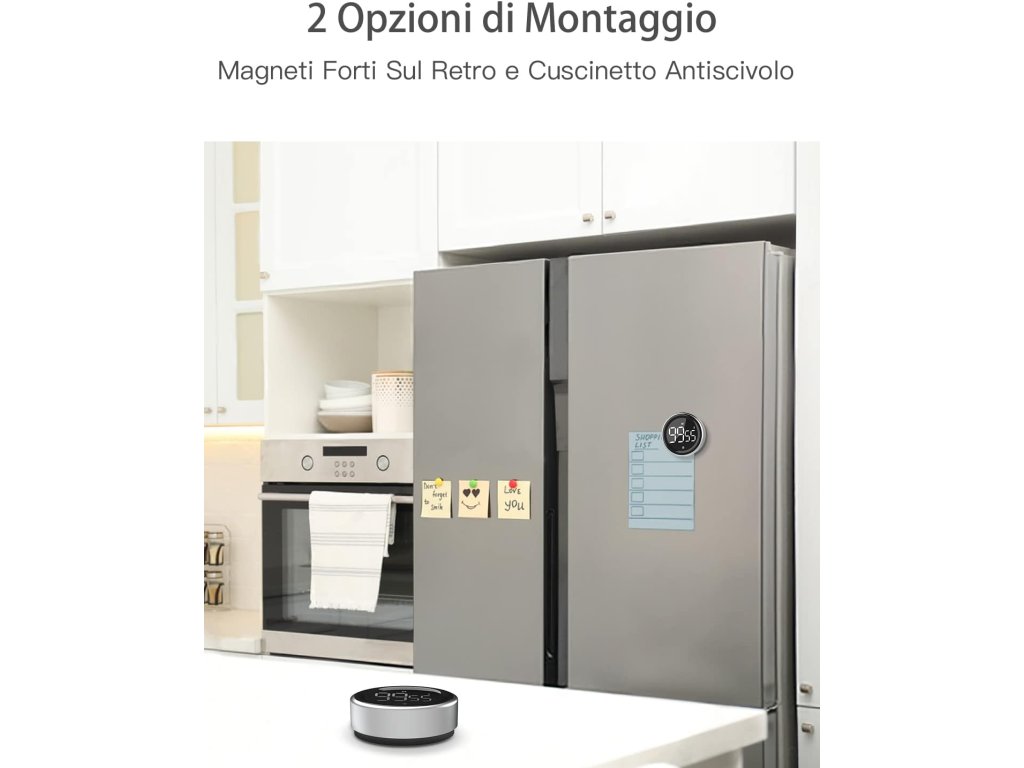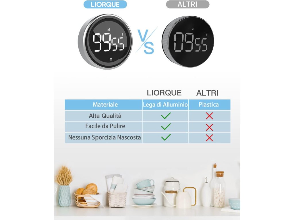 Díky silnému magnetu na zadní straně lze časovač snadno připevnit na ledničku, sporák, tabuli nebo jiné kovové povrchy. Časovač LIORQUE nabízí dva režimy jasu: normální režim s konstantním jasem a režim úspory energie, kdy se číslice ztmavnou po 5 sekundách nečinnosti a po dalších 5 sekundách se displej vypne, čímž se šetří baterie