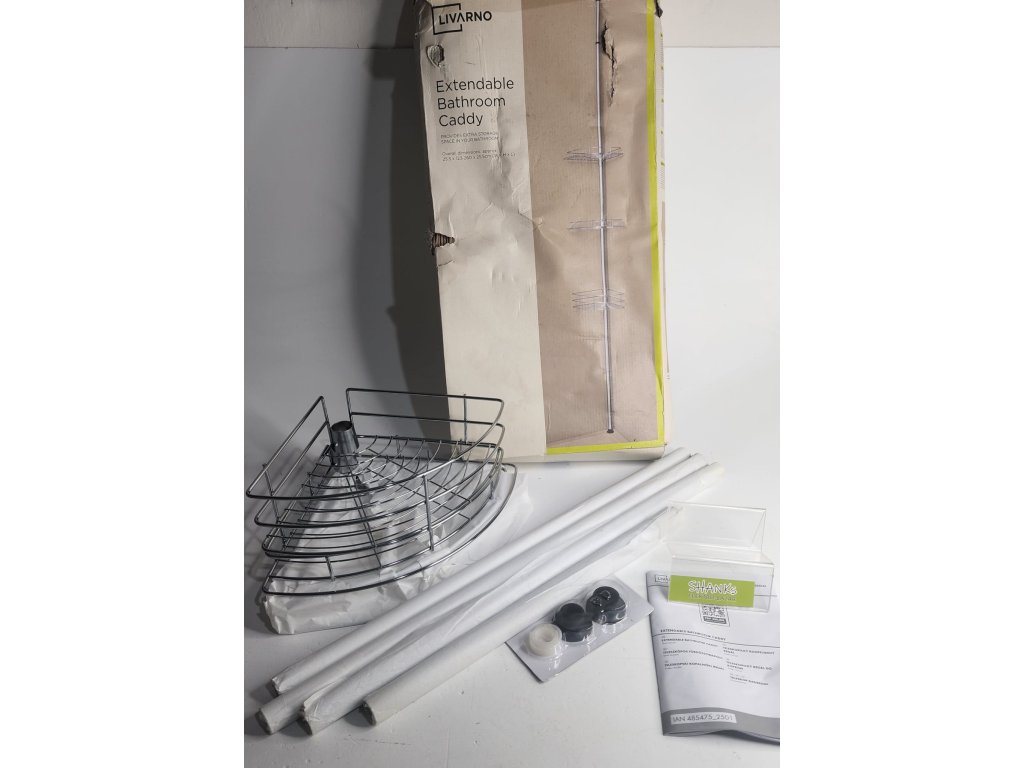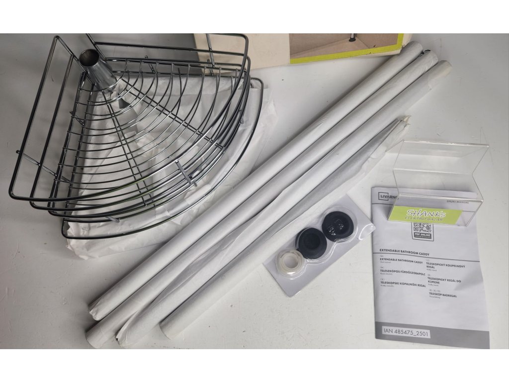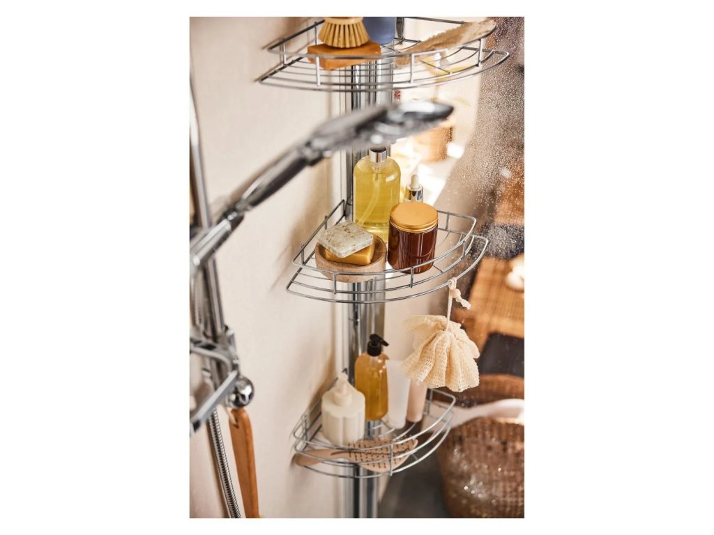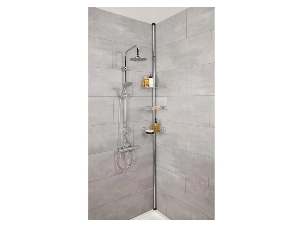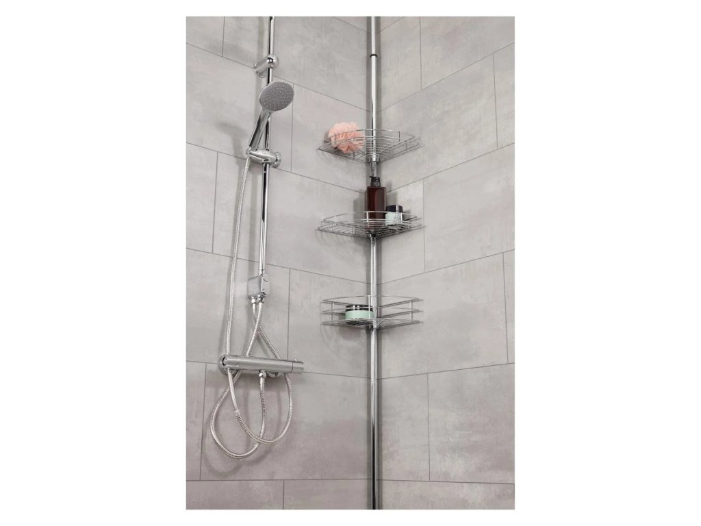 Pro přehledné uložení kosmetiky jsou k dispozici tři prostorné košíky. Každý z nich unese zátěž přibližně 3 kg, dohromady tak poskytují dostatečnou kapacitu pro šampony i další hygienické potřeby. Celková hmotnost regálu činí zhruba 2 kg.
