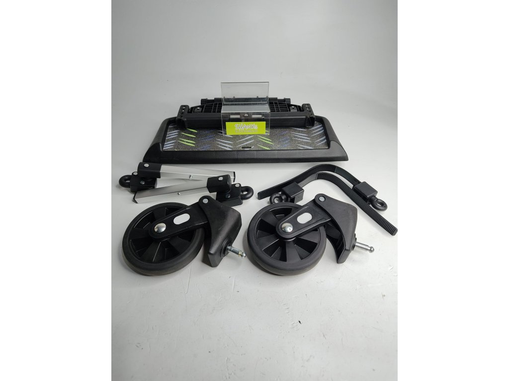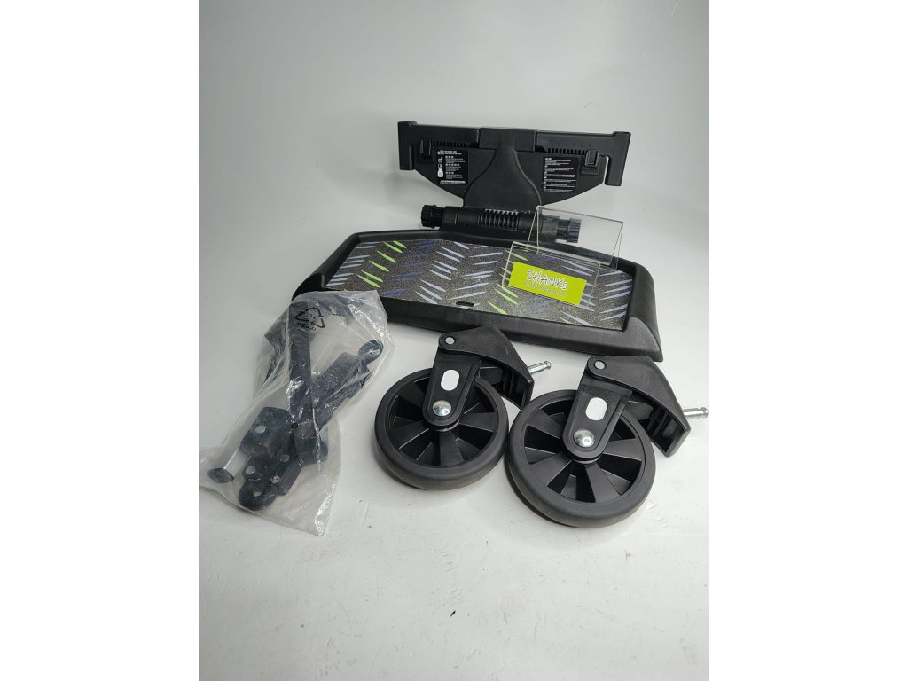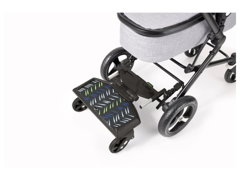 Pro maximální pohodlí a bezpečnost malého pasažéra je stupátko vybaveno odpruženými kolečky, která tlumí nárazy a zajišťují hladkou jízdu. Široká plocha na stání o rozměrech přibližně 37,5 x 17,5 cm disponuje protiskluzovým profilem a zvýšeným okrajem, což minimalizuje riziko sklouznutí. Stupátko je určeno pro děti od 3 let a má maximální nosnost přibližně 20 kg.