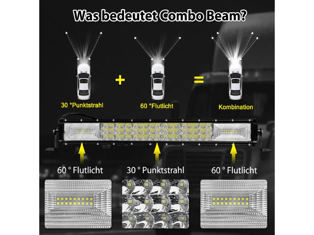 Konstrukce reflektoru kombinuje dva typy světelných kuželů pro maximální efektivitu. Středová část s úhlem 20 stupňů vytváří úzký bodový paprsek pro dosvit do dálky. Krajní části se šířkou 60 stupňů zajišťují široký záplavový svit, který dokonale osvětluje bezprostřední okolí vozidla nebo pracovního stroje. Tento systém eliminuje slepá místa a zvyšuje bezpečnost při pohybu v náročném terénu.