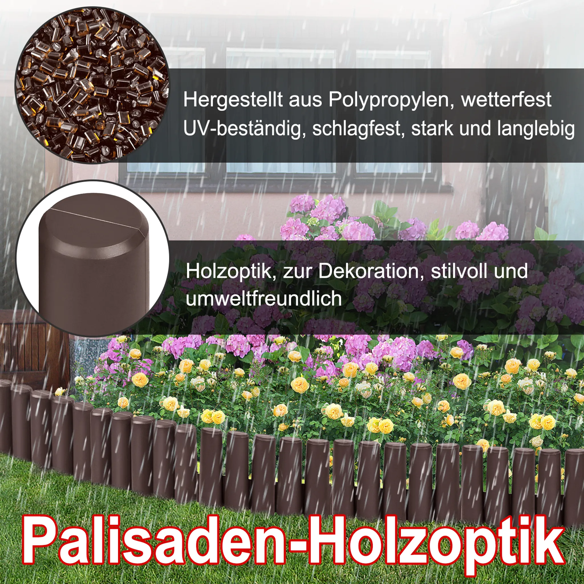 Obruba je vyrobena z vysoce kvalitního polypropylenu, který zajišťuje vynikající odolnost proti UV záření, mrazu i dešti. Povrchová úprava věrně napodobuje přírodní dřevo, čímž palisáda dokonale splyne s okolním prostředím zahrady. Materiál je dostatečně pružný a nárazuvzdorný, což zaručuje jeho dlouhou životnost i v náročných venkovních podmínkách.