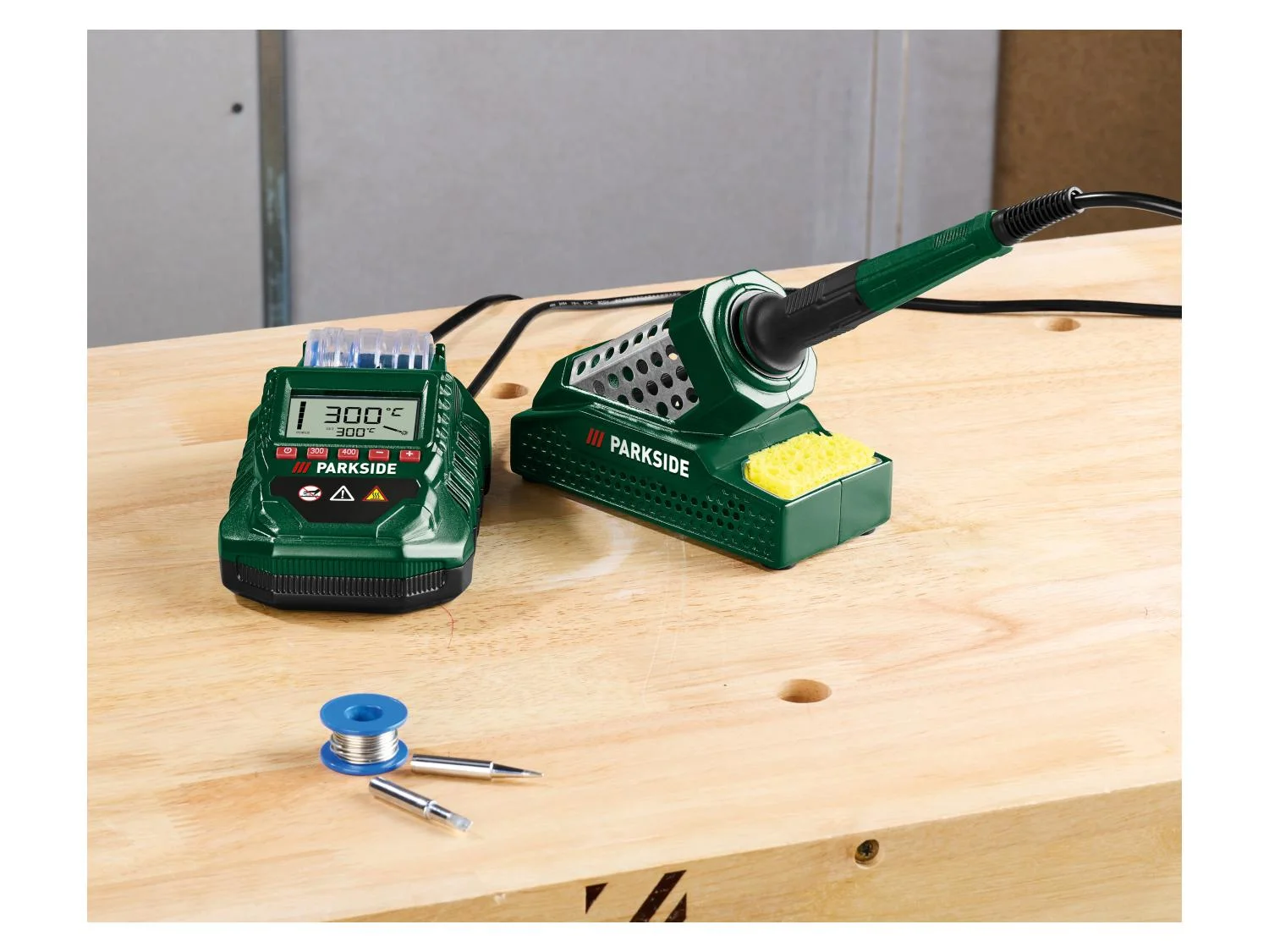Součástí sady jsou dva vyměnitelné hroty a dvě cívky pájky s průměrem 0,8 mm a 1 mm. Stanice obsahuje integrovanou misku s houbou a praktický úložný prostor pro drobné díly. Samostatný držák páječky s uzavřenou ochrannou klecí zajišťuje bezpečné odkládání horkého nástroje.