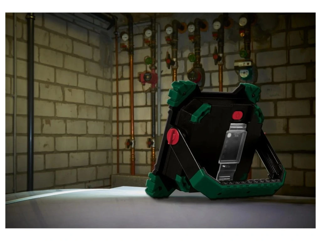 Tělo přístroje splňuje certifikaci IP65, takže spolehlivě odolává prachu i stříkající vodě při venkovním použití. Nárazuvzdorné materiály chrání zařízení před následky pádů nebo nešetrného zacházení v dílně. Stabilní polohu na rovném povrchu zajišťuje výklopný magnetický podstavec, celou konstrukci lze ovšem také snadno zavěsit na pevný hák.