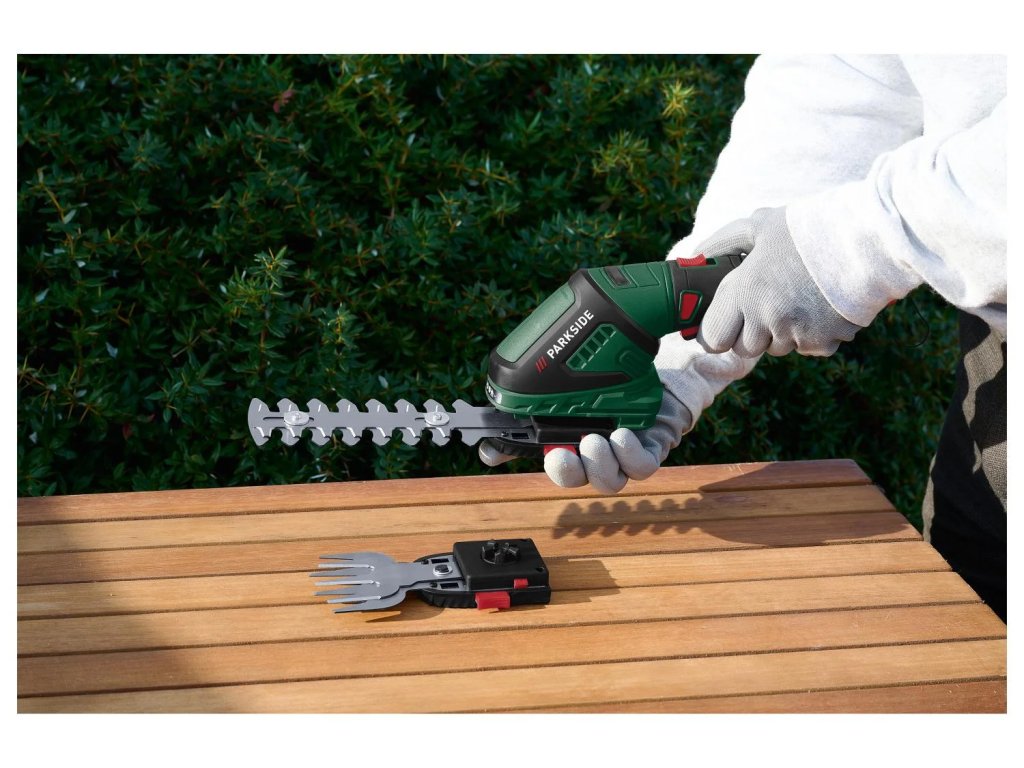 Tyto nůžky nabízejí funkci 2 v 1, disponují jedním nožem na trávník o šířce střihu přibližně 8 cm a jedním nožem na živý plot s délkou řezu asi 12 cm a maximální tloušťkou řezu 8 mm. Klíčovou předností je systém beznástrojové výměny nože pomocí nacvakávacího mechanismu, který umožňuje rychlé a snadné přepínání mezi oběma funkcemi. S nominálními otáčkami 1 100 za minutu je zajištěn čistý a efektivní střih.