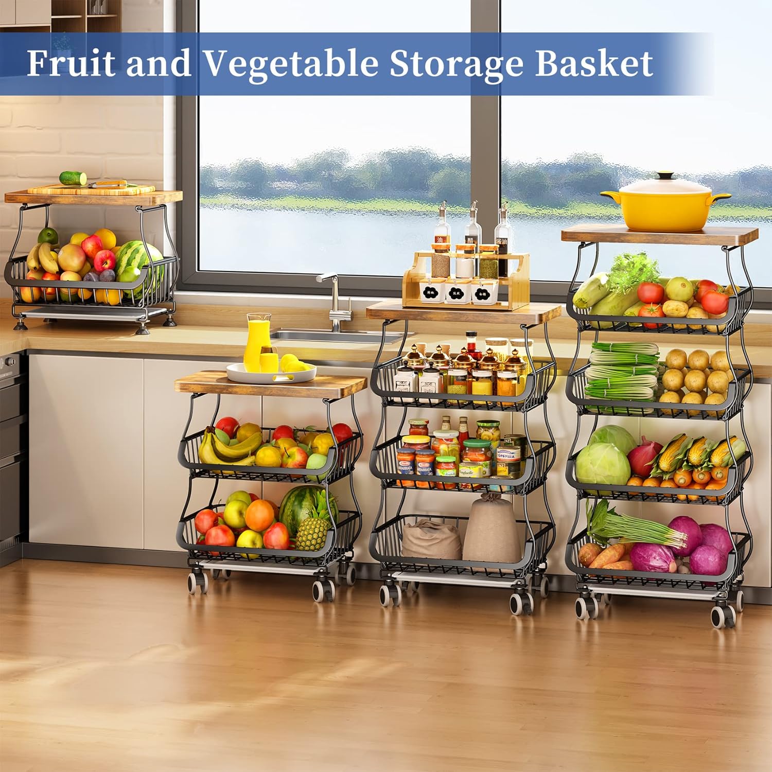 Horní strana vozíku je osazena pevnou dřevěnou deskou, která slouží jako odkládací plocha pro předměty denní potřeby. Drátěný systém je ideální pro skladování cibule, brambor i čerstvého ovoce. Díky svému univerzálnímu designu najde uplatnění nejen v kuchyni, ale také v ložnici, prádelně nebo garáži, kde pomáhá udržovat dokonalý pořádek.