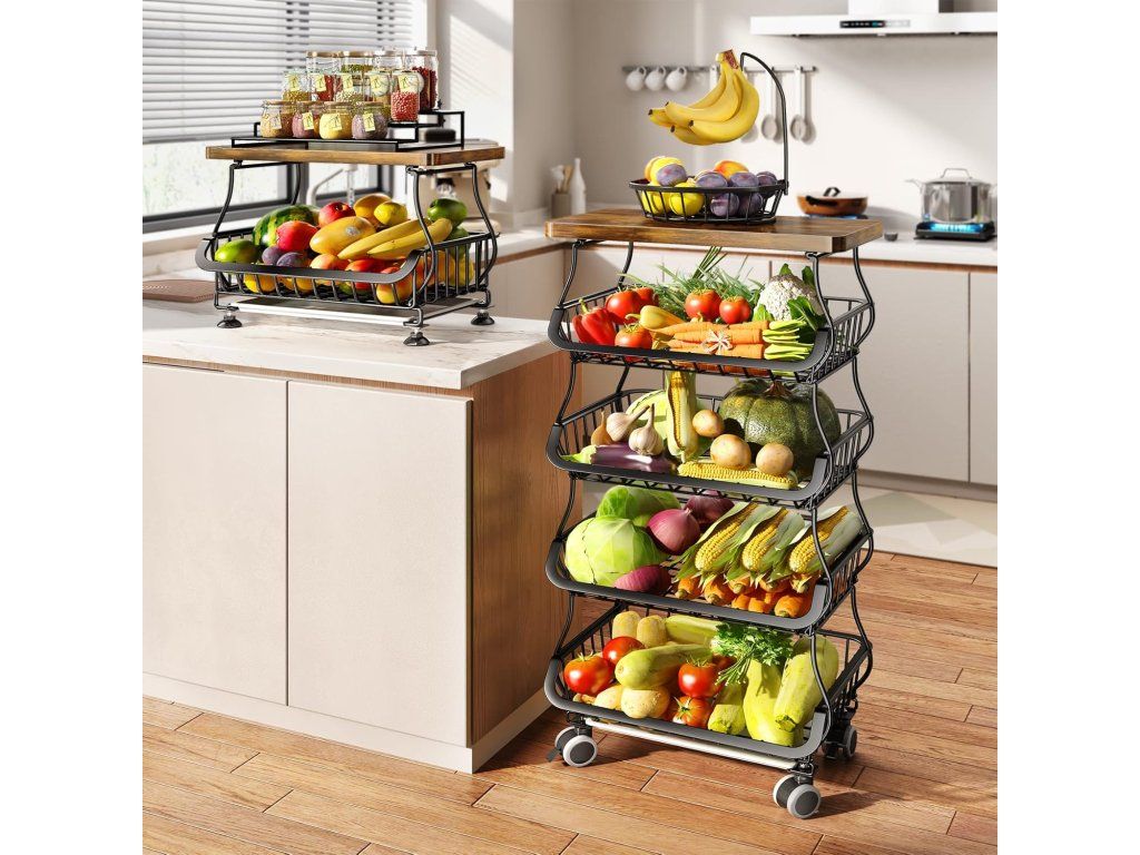 Horní strana vozíku je osazena pevnou dřevěnou deskou, která slouží jako odkládací plocha pro předměty denní potřeby. Drátěný systém je ideální pro skladování cibule, brambor i čerstvého ovoce. Díky svému univerzálnímu designu najde uplatnění nejen v kuchyni, ale také v ložnici, prádelně nebo garáži, kde pomáhá udržovat dokonalý pořádek.