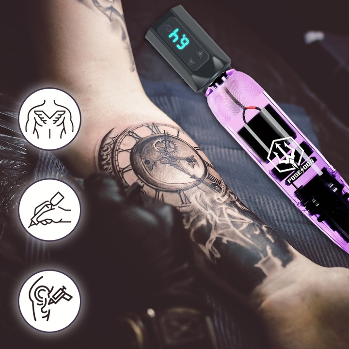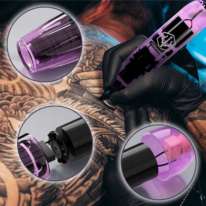 Baterie umožňuje až 6 hodin provozu po přibližně 1,5 hodině nabíjení. Stabilní výkon podporuje plynulé tetování bez výpadků. Bezdrátové provedení s vyměnitelnými bateriemi usnadňuje manipulaci.