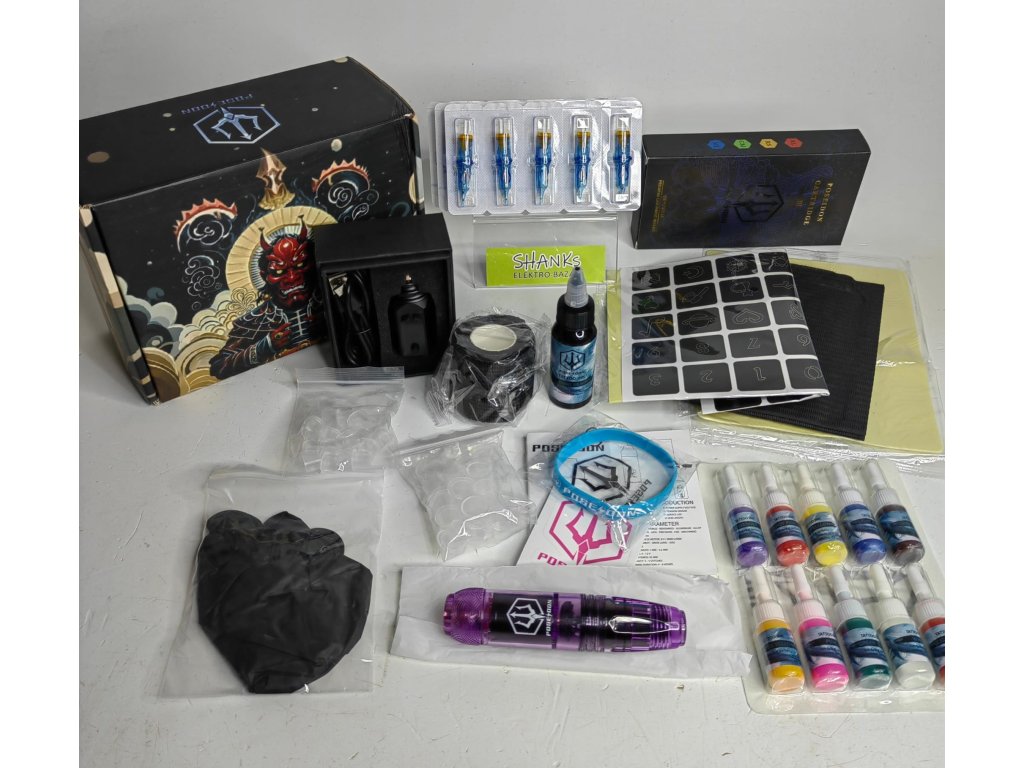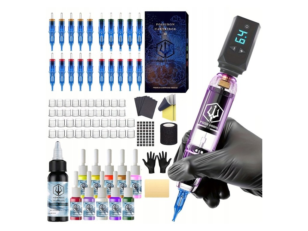 POSEIDON kompletní sada na tetování s 20 jehlami a 11 inkousty