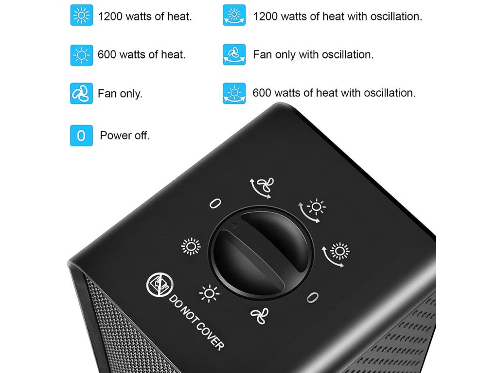 Zařízení pracuje s moderním keramickým topným tělesem, které dosahuje vysoké tepelné účinnosti a stability. Uživatel si může zvolit mezi dvěma rychlostními stupni o výkonu 600 W nebo 1200 W podle aktuální potřeby. Teplota vzduchu na výstupu dosahuje až 140 stupňů Celsia a zajišťuje tak okamžitý tepelný komfort i ve velmi chladných prostorách.