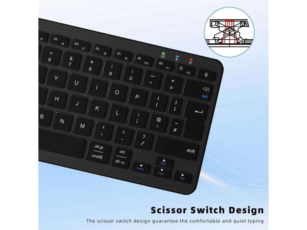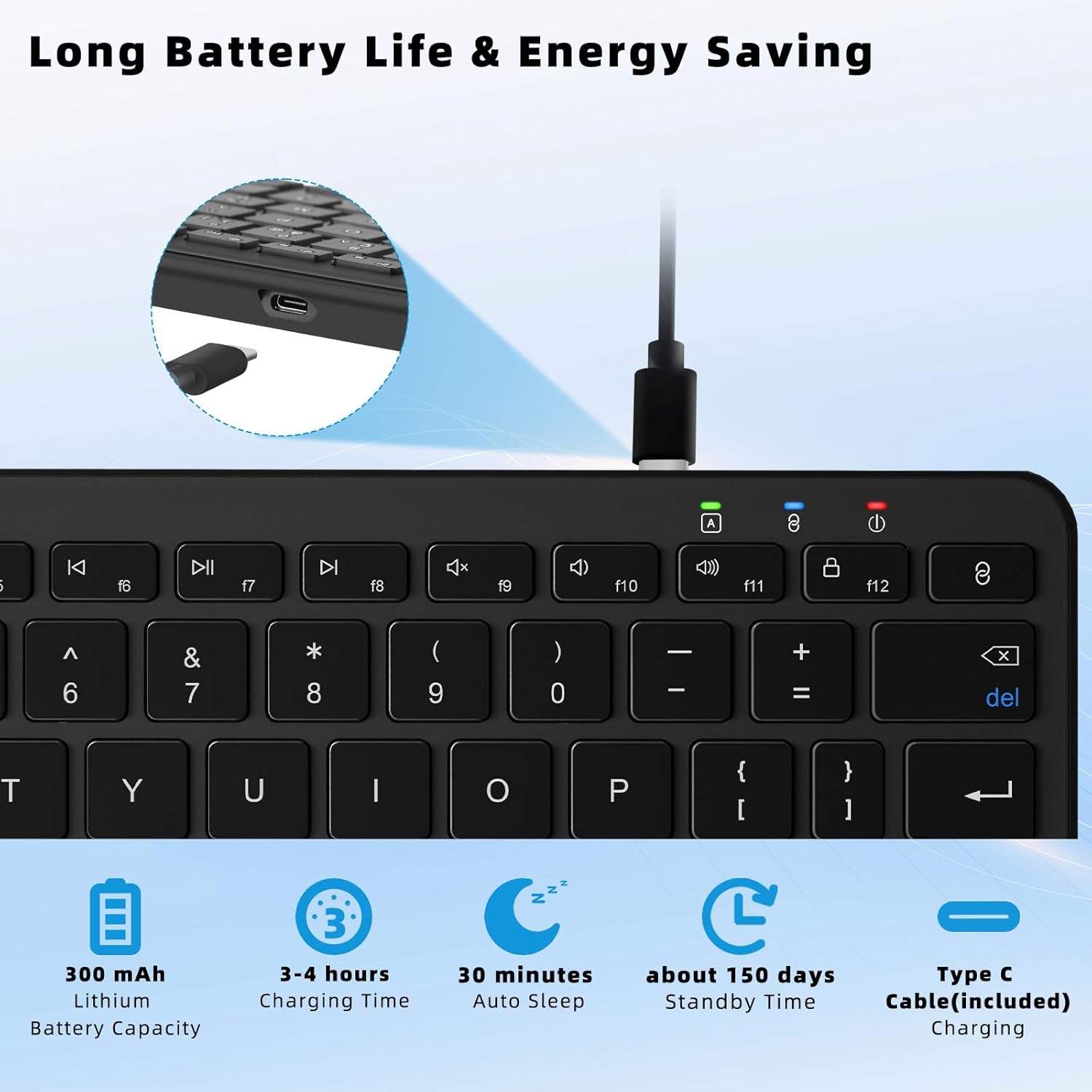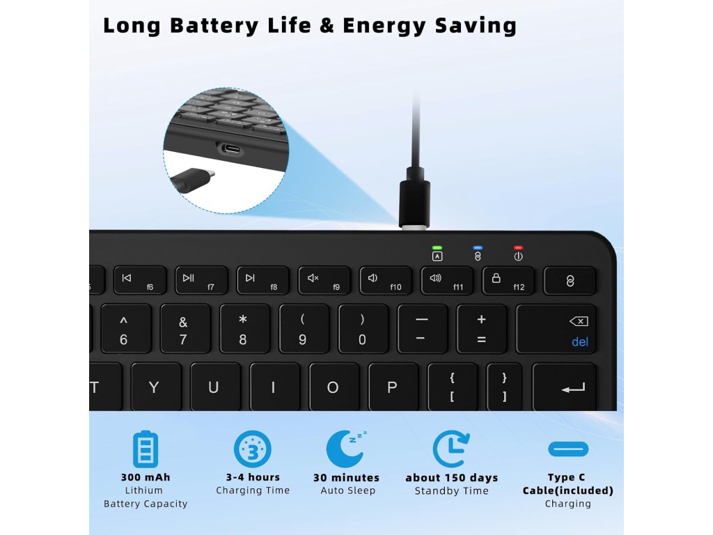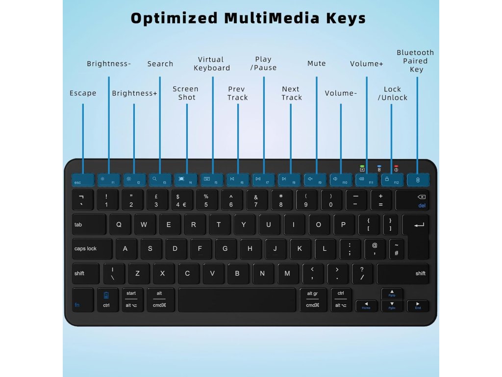 Tato mini bezdrátová klávesnice je vyrobena v kompaktním černém provedení s britským (UK) rozložením kláves. Díky malým rozměrům a nízké hmotnosti je ideální volbou pro uživatele, kteří často cestují nebo potřebují flexibilní řešení pro psaní na více zařízeních, aniž by s sebou museli nosit velkou a těžkou klávesnici