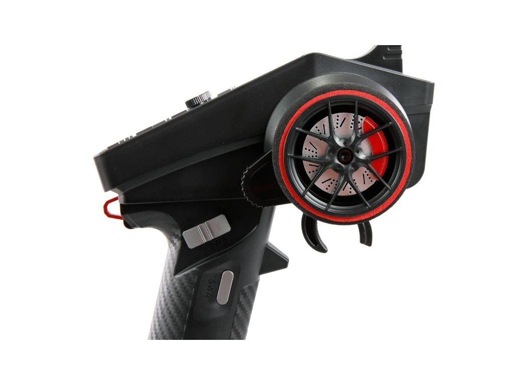 Dálkový ovladač o hmotnosti pouhých 230 g padne velmi dobře do ruky. Je vybaven vysoce kvalitními potenciometry pro odolnost a citlivé ovládání. Pohodlné ovládání jednou rukou zajišťuje přídavná páka namontovaná na volantu. Ovládací prvky zahrnují plyn, řízení, tlačítko na rukojeti (SWB), třípolohový přepínač nad rukojetí (SWA) a dvě jednoduchá tlačítka nahoře. Digitální trim udržuje všechna nastavení, i když je dálkový ovladač vypnutý.