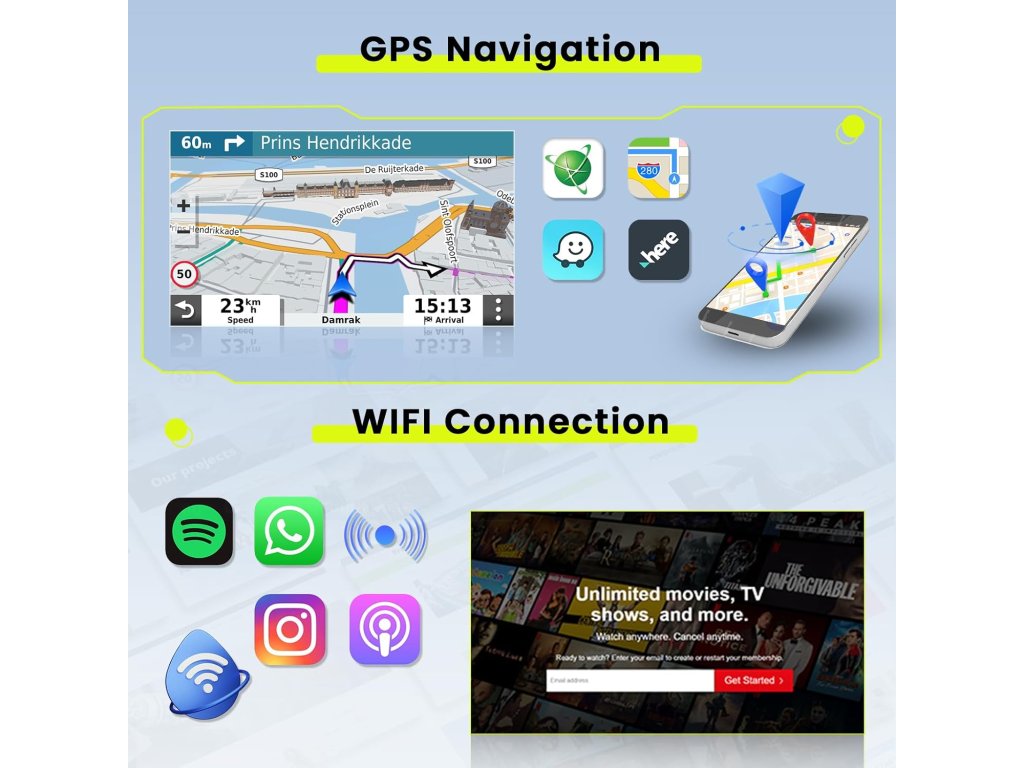 Díky integrovanému GPS modulu a WiFi konektivitě je možné stahovat oblíbené aplikace, jako je YouTube nebo TikTok, a využívat online mapy nebo bezplatné offline mapy, například Waze. Podpora rozdělené obrazovky umožňuje současné zobrazení dvou funkcí, například navigace a FM rádia. Autorádio podporuje RDS a FM příjem.