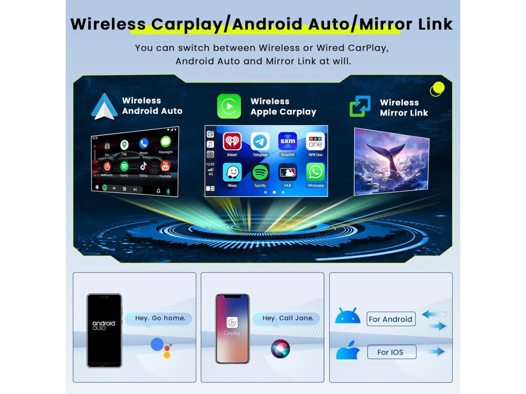 Vestavěné funkce bezdrátového a kabelového CarPlay a Android Auto umožňují hlasové ovládání a přístup k aplikacím z mobilního telefonu (navigace, hudba, volání, zprávy) prostřednictvím WiFi hotspotu nebo originálního USB kabelu.