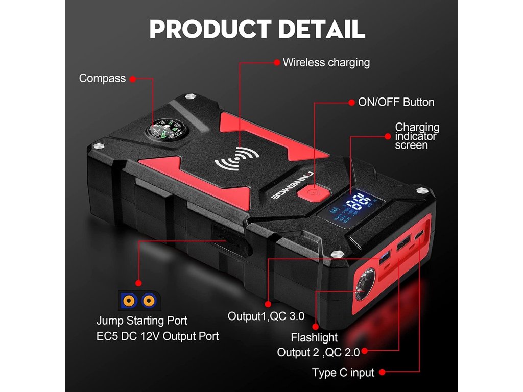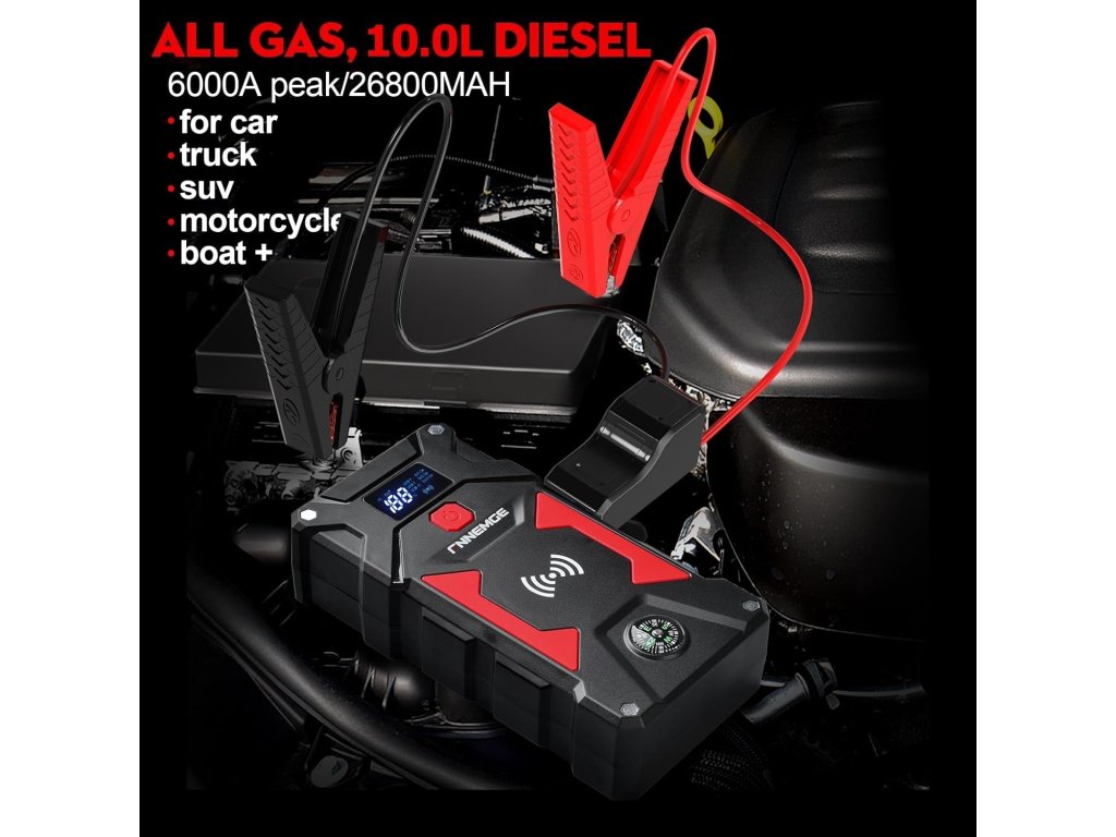 Díky obrovské kapacitě 26800 mAh a špičkovému proudu 6000 A je tento startér schopen nastartovat 12V vozidla, včetně automobilů, nákladních vozů, motocyklů, vodních skútrů, sekaček na trávu nebo sněžných skútrů. Podporuje všechny benzínové motory a dieselové motory do objemu 10,0 l. Pomocí přiloženého adaptéru EC-5 můžete snadno napájet 12V zařízení, jako je autovysavač, kompresor nebo autochladnička.