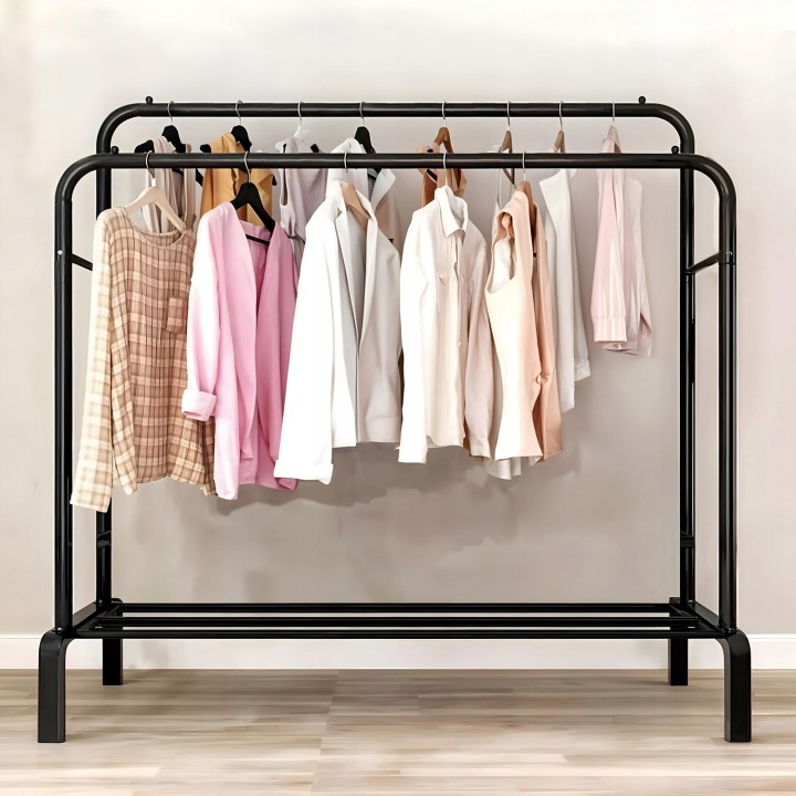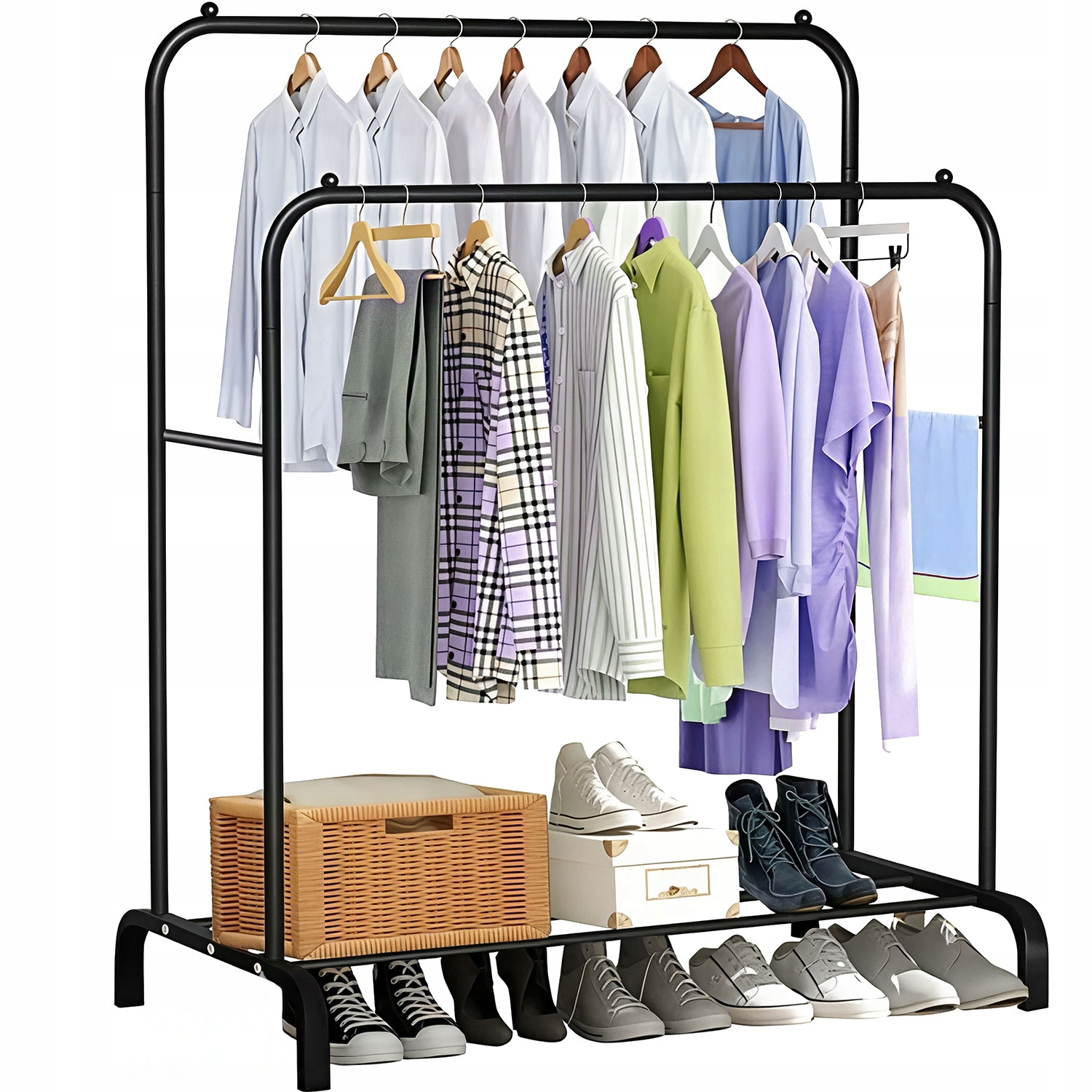 Dvouúrovňová konstrukce se dvěma tyčemi výrazně zvyšuje kapacitu pro zavěšení oděvů oproti standardním věšákům. Každá tyč je vybavena protiskluzovými blokádami, které spolehlivě zabraňují sklouznutí ramínek. Spodní drátěná police nabízí praktický úložný prostor pro obuv, úložné boxy nebo tašky, díky čemuž zůstane podlaha v místnosti vždy uklizená.