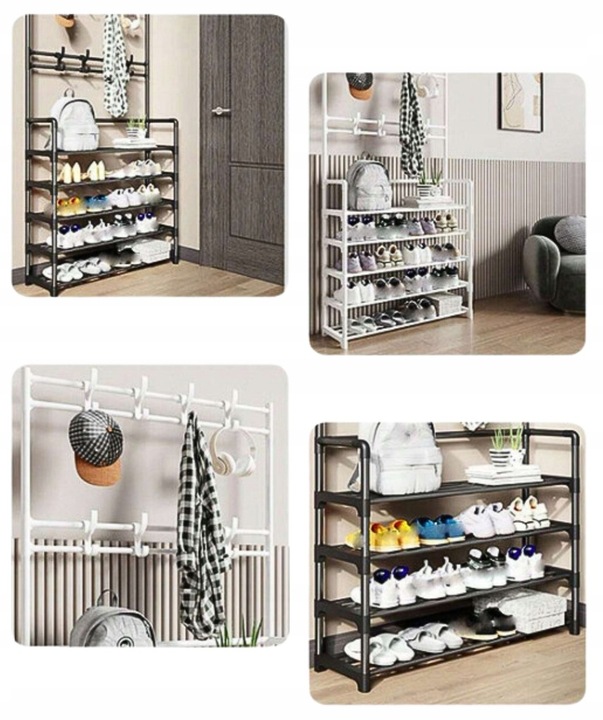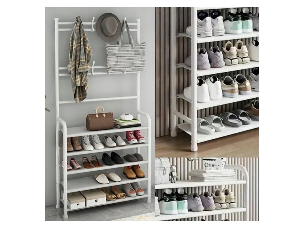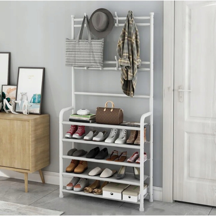 Stojací multifunkční věšák na oblečení a boty, 5 polic a 8 háčků, bílý