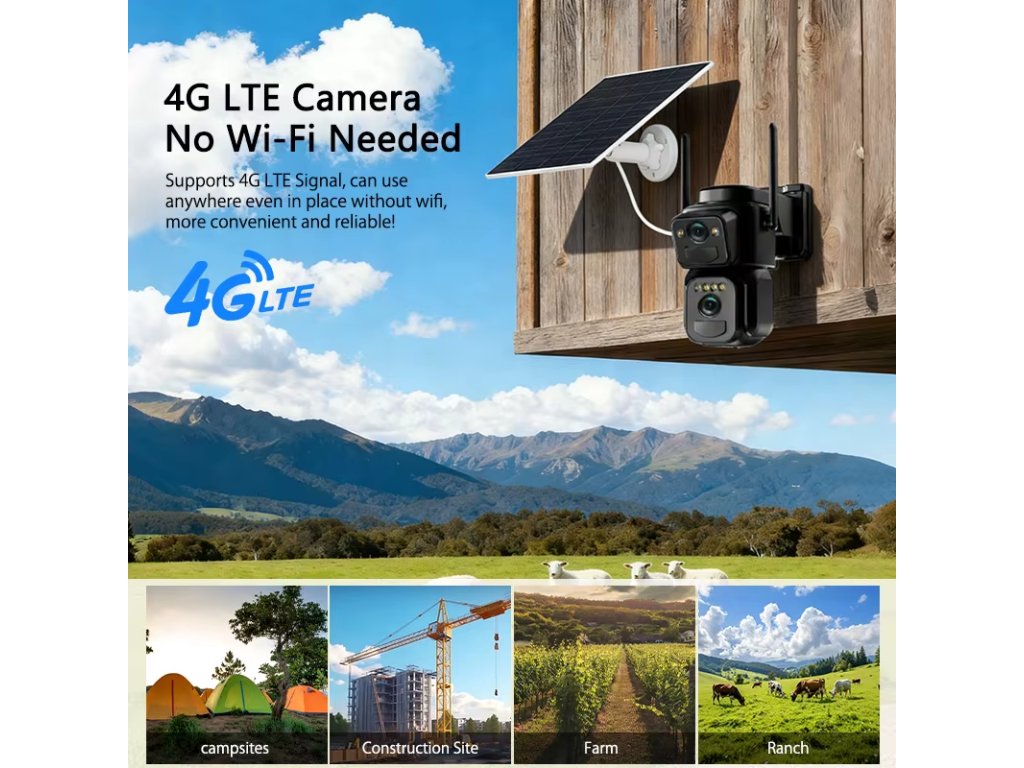 Kamera je navržena pro zcela bezdrátový provoz. Je vybavena solárním panelem a integrovanou baterií, proto nepotřebuje žádné kabely ani externí zdroj energie. K přenosu dat využívá mobilní síť 4G LTE. Toto řešení je ideální pro farmy, stavby, kempy nebo ranče, kde není dostupné standardní Wi-Fi připojení.