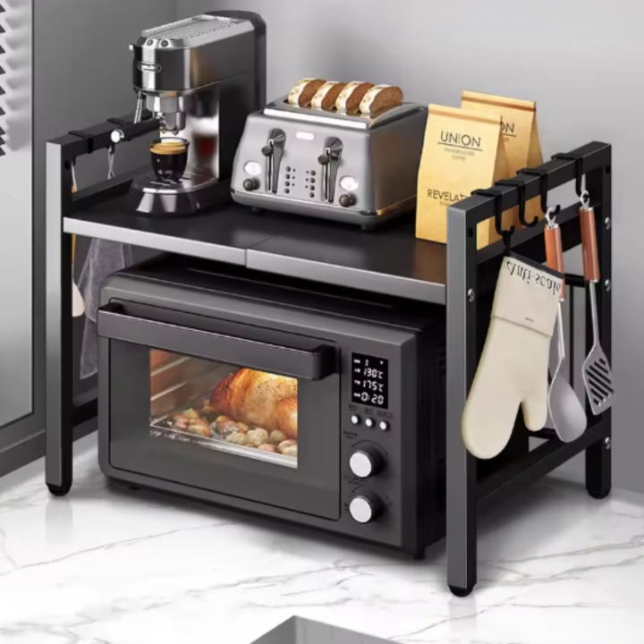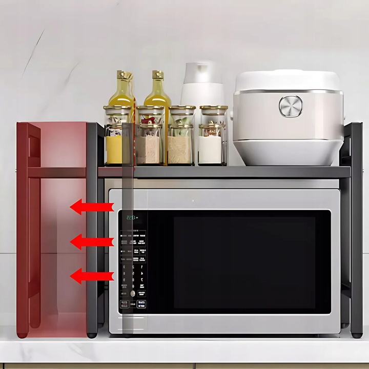 Tento kuchyňský regál disponuje speciálním mechanismem, díky kterému lze plynule měnit jeho šířku od 41 cm do 60 cm. Toto rozpětí umožňuje přesné přizpůsobení různým typům mikrovlnných trub nebo volnému místu na pracovní desce. Horní plocha slouží jako ideální odkládací prostor pro toustovače, kořenky či jiné nádoby.