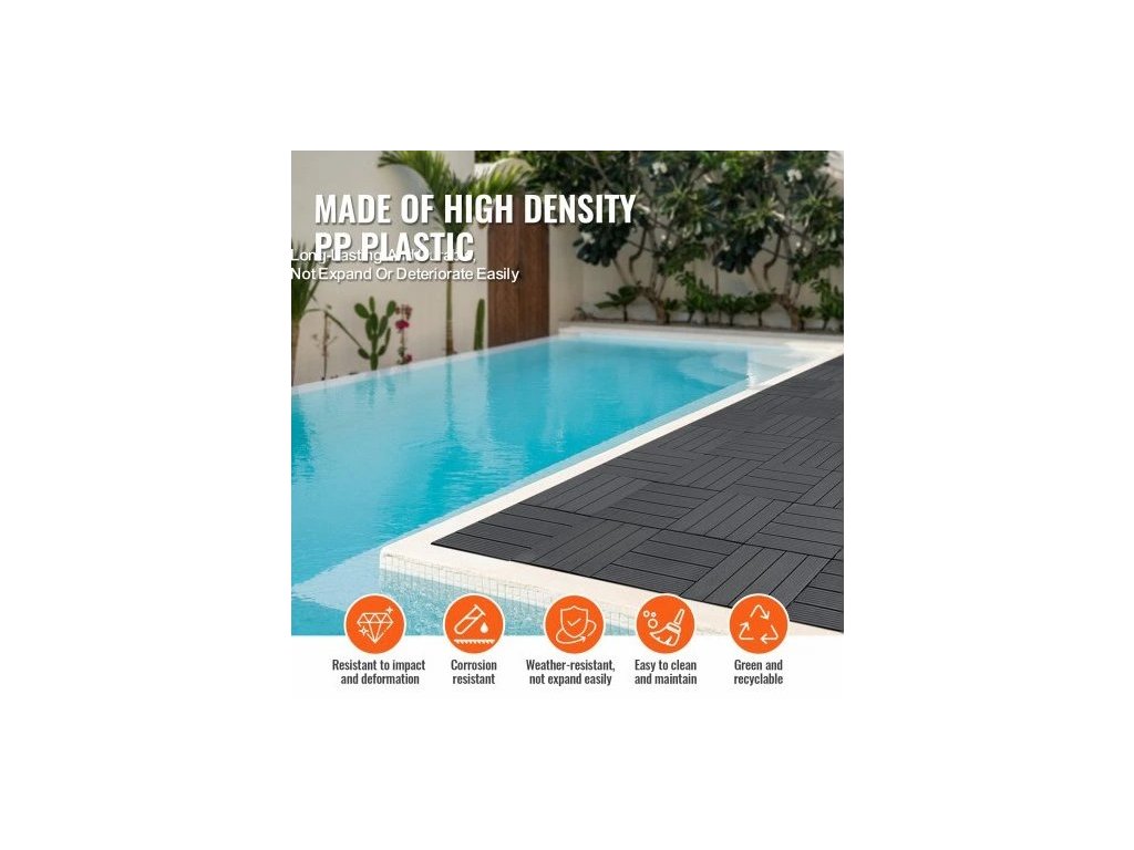 Konstrukce dlaždic je navržena pro maximální odolnost proti mechanickému poškození i vnějším vlivům. Robustní plastový materiál hravě zvládá vysokou nosnost, takže je podlaha vhodná i pro umístění těžšího zahradního nábytku nebo častý pohyb osob. Voděodolné provedení zabraňuje nasákavosti a chrání integritu materiálu před mrazem, deštěm i přímým slunečním zářením, čímž prodlužuje estetickou hodnotu celého balení.
