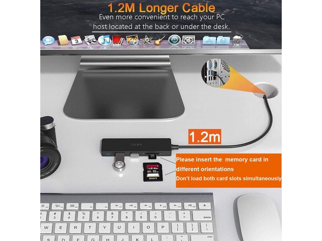 S délkou kabelu 1,2 metru se hub Tsupy snadno dostane k vašemu počítači, i když je umístěn pod stolem nebo na hůře dostupném místě. Díky tomu si jej můžete umístit na stůl pro snadný přístup ke všem portům. Hub funguje na principu Plug and Play a nevyžaduje žádnou instalaci softwaru ani externí napájení. Jednoduše jej připojíte a můžete začít pracovat. Je kompatibilní s operačními systémy Windows, Mac OS X, Linux a Chrome OS